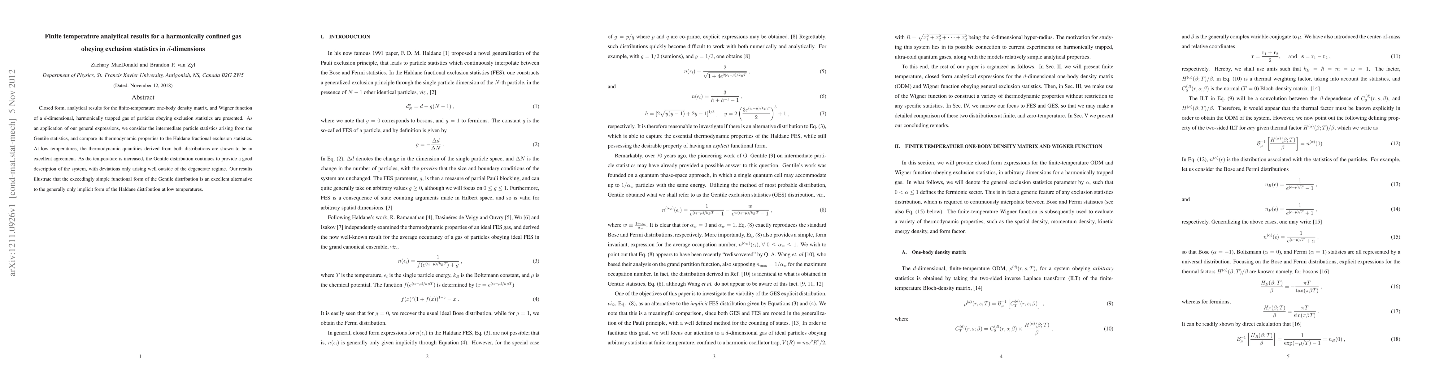 Closed form, analytical results for the finite-temperature one-body density matrix, and Wigner function of a $d$-dimensional, harmonically trapped gas of particles obeying exclusion statistics are presented. As an application of our general expressions, we consider the intermediate particle statistics arising from the Gentile statistics, and compare its thermodynamic properties to the Haldane fractional exclusion statistics. At low temperatures, the thermodynamic quantities derived from both distributions are shown to be in excellent agreement. As the temperature is increased, the Gentile distribution continues to provide a good description of the system, with deviations only arising well outside of the degenerate regime. Our results illustrate that the exceedingly simple functional form of the Gentile distribution is an excellent alternative to the generally only implicit form of the Haldane distribution at low temperatures.