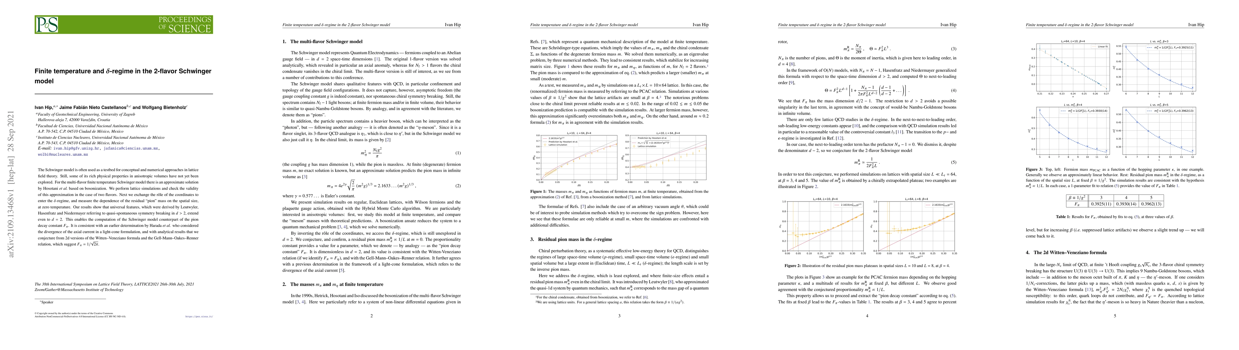 This paper investigates the finite temperature and delta-regime in the 2-flavor Schwinger model through lattice simulations, confirming the validity of an approximate bosonization solution. It also explores the residual pion mass dependence on spatial size, revealing universal features extending to $d=2$ and enabling the computation of the pion decay constant $F_{\pi}$, consistent with earlier analytical determinations.