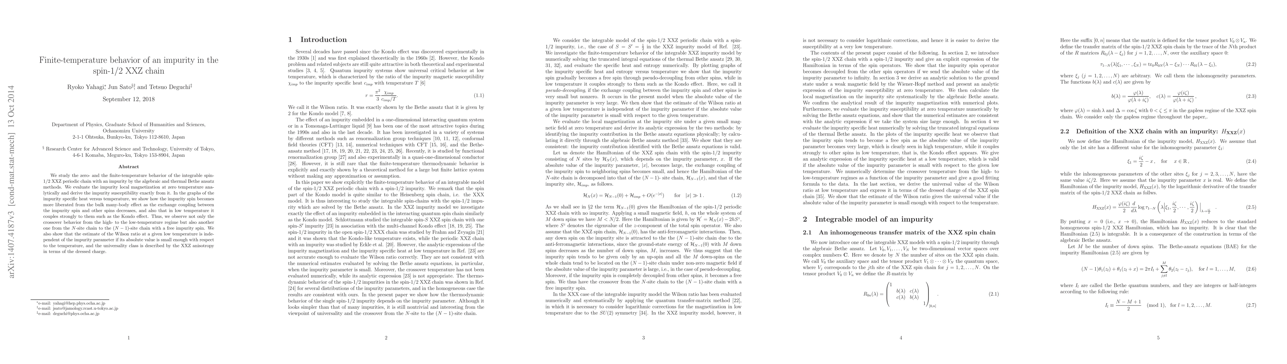This paper investigates the finite-temperature behavior of an impurity in a spin-1/2 XXZ chain using algebraic and thermal Bethe ansatz methods, revealing a transition from high- to low-temperature regimes and a crossover from an $N$-site to $(N-1)$-site chain with a free impurity spin, akin to the Kondo effect. The study also shows that the Wilson ratio at low temperatures is independent of the impurity parameter when its magnitude is small relative to the temperature.
