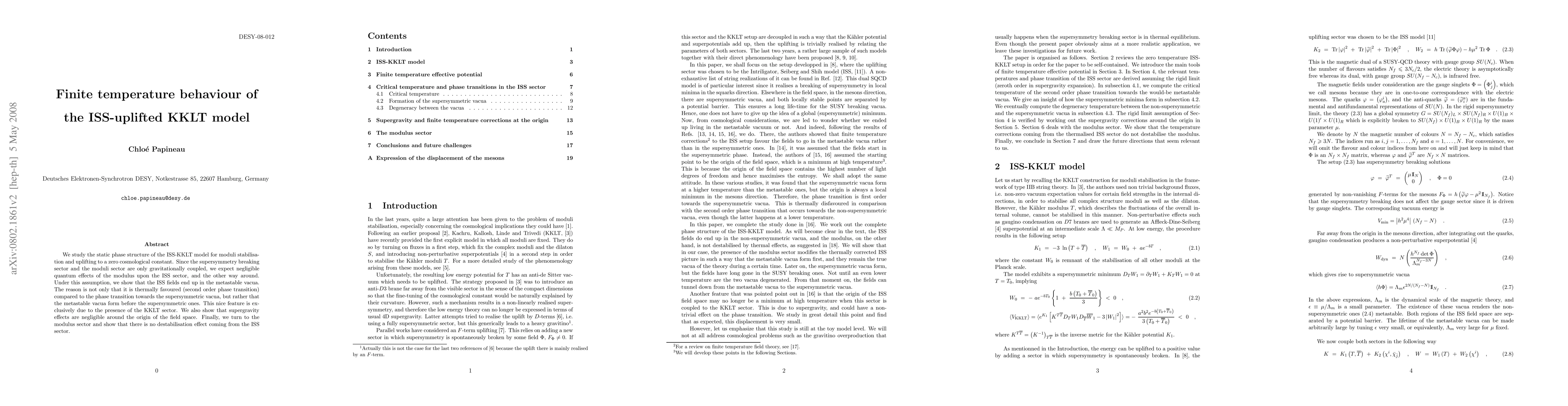 We study the static phase structure of the ISS-KKLT model for moduli stabilisation and uplifting to a zero cosmological constant. Since the supersymmetry breaking sector and the moduli sector are only gravitationally coupled, we expect negligible quantum effects of the modulus upon the ISS sector, and the other way around. Under this assumption, we show that the ISS fields end up in the metastable vacua. The reason is not only that it is thermally favoured (second order phase transition) compared to the phase transition towards the supersymmetric vacua, but rather that the metastable vacua form before the supersymmetric ones. This nice feature is exclusively due to the presence of the KKLT sector. We also show that supergravity effects are negligible around the origin of the field space. Finally, we turn to the modulus sector and show that there is no destabilisation effect coming from the ISS sector.