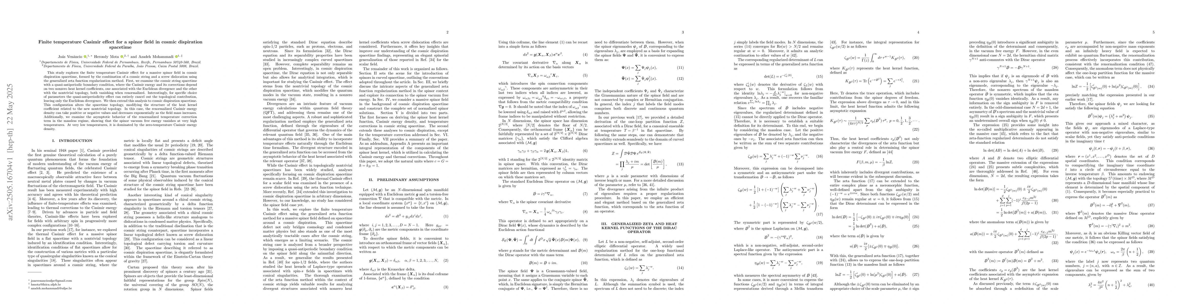 The research employs the generalized zeta function regularization method to study the finite temperature Casimir effect for a massive spinor field in cosmic dispiration spacetime, formed by a cosmic string and a screw dislocation.
