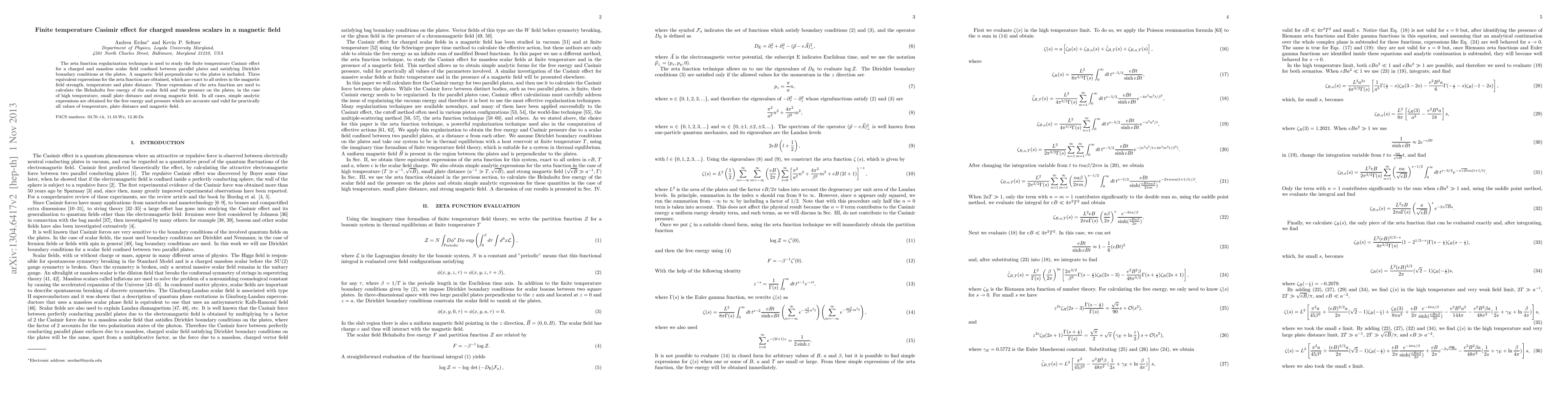 The zeta function regularization technique is used to study the finite temperature Casimir effect for a charged and massless scalar field confined between parallel plates and satisfying Dirichlet boundary conditions at the plates. A magnetic field perpendicular to the plates is included. Three equivalent expressions for the zeta function are obtained, which are exact to all orders in the magnetic field strength, temperature and plate distance. These expressions of the zeta function are used to calculate the Helmholtz free energy of the scalar field and the pressure on the plates, in the case of high temperature, small plate distance and strong magnetic field. In all cases, simple analytic expressions are obtained for the free energy and pressure which are accurate and valid for practically all values of temperature, plate distance and magnetic field.