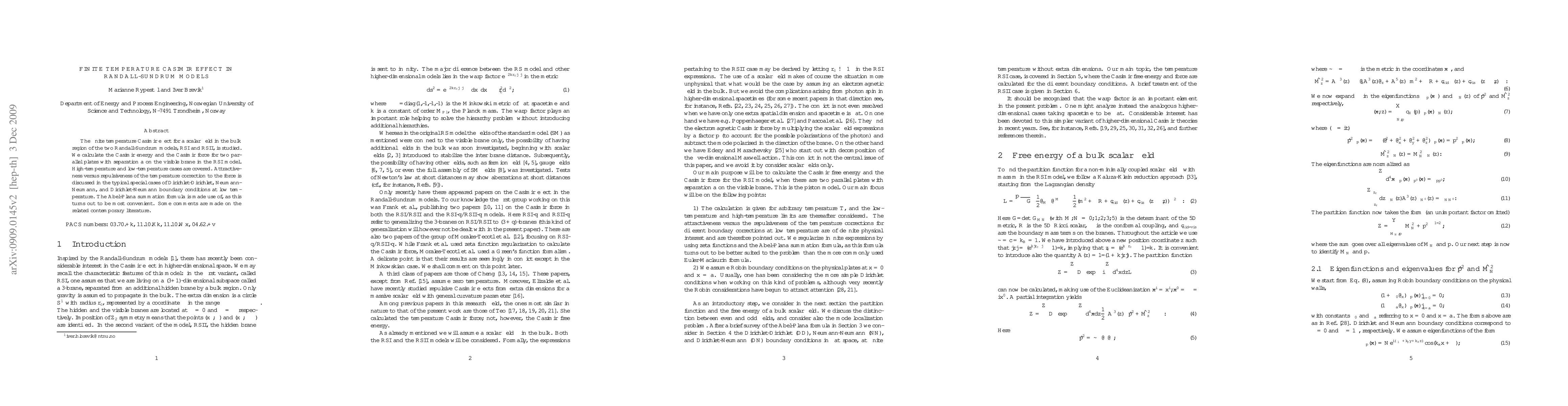 The finite temperature Casimir effect for a scalar field in the bulk region of the two Randall-Sundrum models, RSI and RSII, is studied. We calculate the Casimir energy and the Casimir force for two parallel plates with separation $a$ on the visible brane in the RSI model. High-temperature and low-temperature cases are covered. Attractiveness versus repulsiveness of the temperature correction to the force is discussed in the typical special cases of Dirichlet-Dirichlet, Neumann-Neumann, and Dirichlet-Neumann boundary conditions at low temperature. The Abel-Plana summation formula is made use of, as this turns out to be most convenient. Some comments are made on the related contemporary literature.