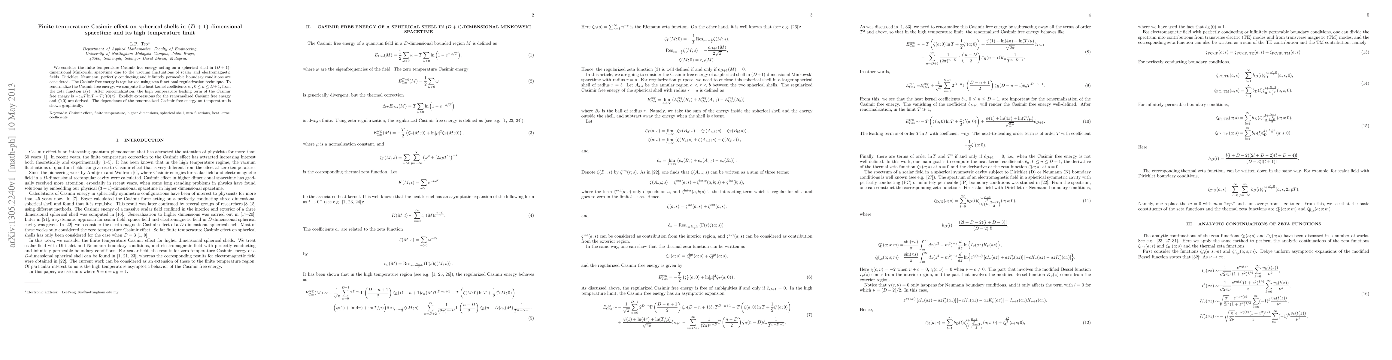 This paper investigates the finite temperature Casimir effect on spherical shells in (D+1)-dimensional spacetime, analyzing the vacuum fluctuations of scalar and electromagnetic fields under various boundary conditions. The study employs zeta functional regularization and heat kernel coefficients to derive the renormalized Casimir free energy, revealing a high temperature leading term of $-c_DT\ln T-T \zeta'(0)/2$.