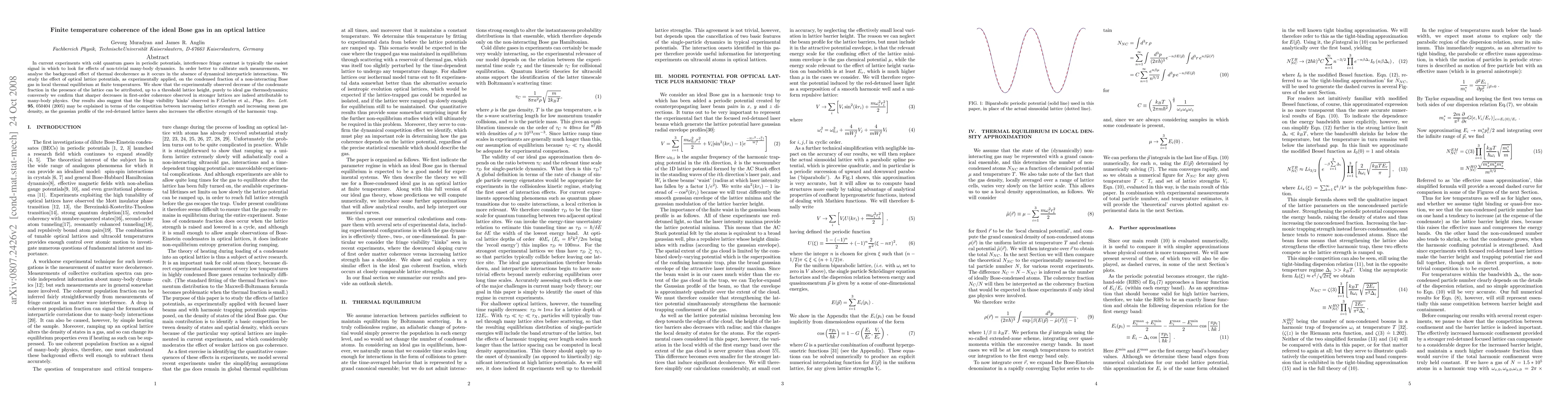 This paper investigates the thermal decoherence effects in an ideal Bose gas within an optical lattice at finite temperatures, demonstrating that the observed decrease in the condensate fraction is primarily due to ideal gas thermodynamics up to a certain lattice strength. It confirms that stronger lattices cause sharper decreases in coherence due to many-body dynamics.