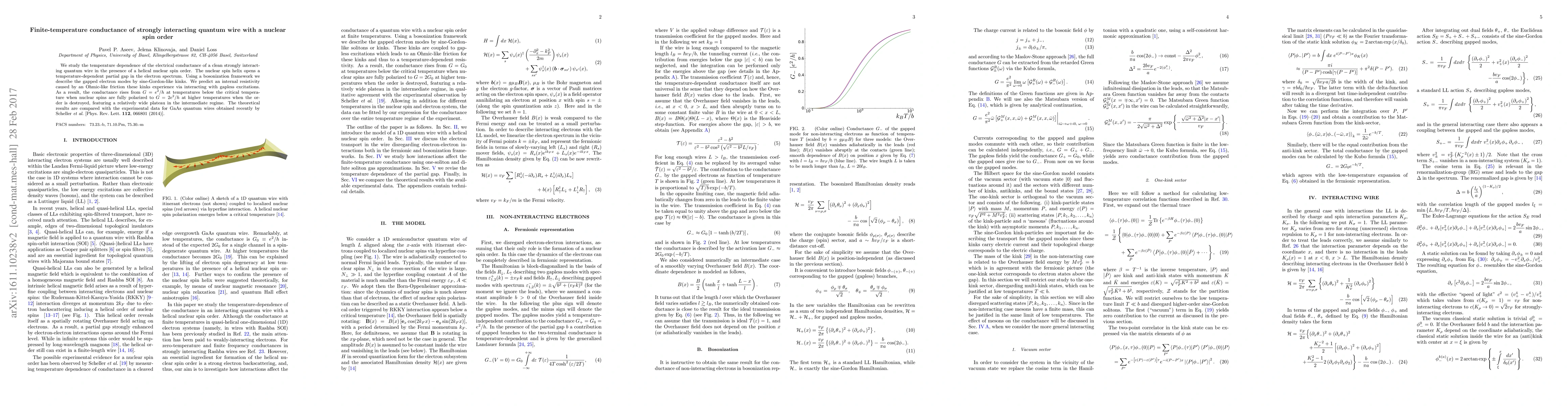 This paper investigates the temperature-dependent electrical conductance in a strongly interacting quantum wire with a helical nuclear spin order, predicting a rise in conductance from $G=e^2/h$ to $G=2e^2/h$ as the temperature increases, due to the interaction of sine-Gordon-like kinks with gapless excitations. The findings are corroborated by experimental data from GaAs quantum wires.