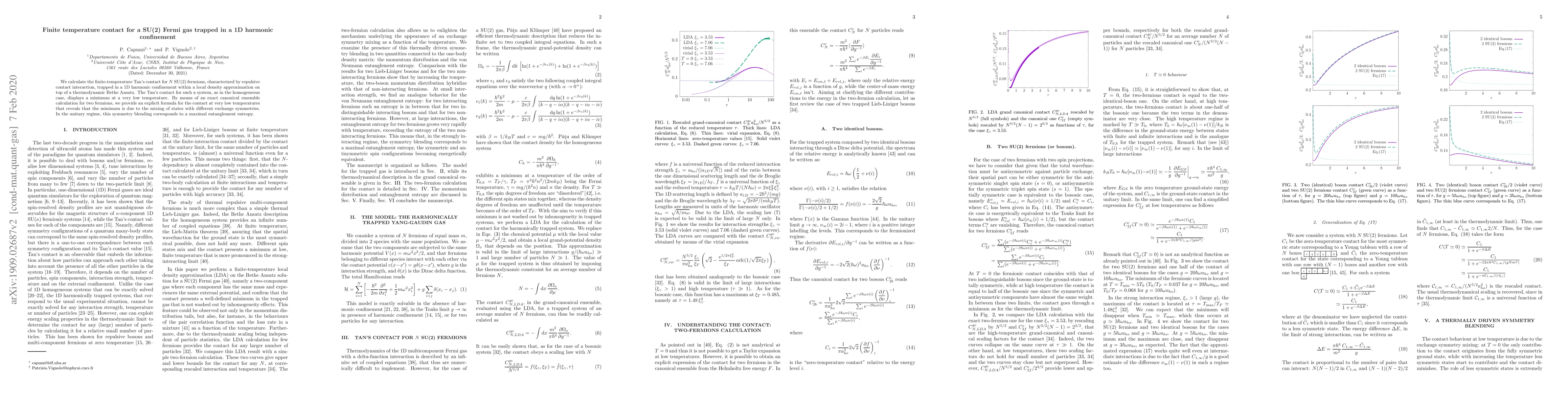 We calculate the finite-temperature Tan's contact for N SU(2) fermions, characterized by repulsive contact interaction, trapped in a 1D harmonic confinement within a local density approximation on top of a thermodynamic Bethe Ansatz. The Tan's contact for such a system, as in the homogeneous case, displays a minimum at a very low temperature. By means of an exact canonical ensemble calculation for two fermions, we provide an explicit formula for the contact at very low temperatures that reveals that the minimum is due to the mixing of states with different exchange symmetries. In the unitary regime, this symmetry blending corresponds to a maximal entanglement entropy.