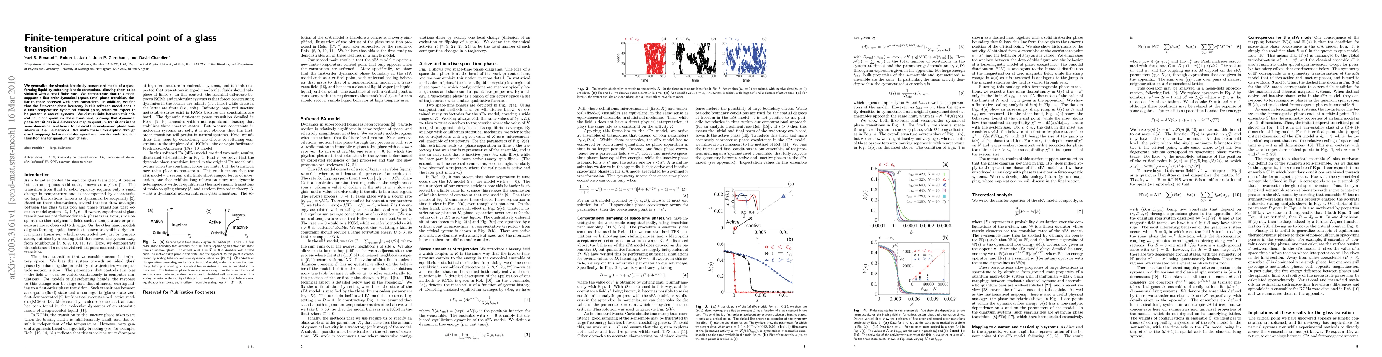 We generalize the simplest kinetically constrained model of a glass-forming liquid by softening kinetic constraints, allowing them to be violated with a small finite rate. We demonstrate that this model supports a first-order dynamical (space-time) phase transition, similar to those observed with hard constraints. In addition, we find that the first-order phase boundary in this softened model ends in a finite-temperature dynamical critical point, which we expect to be present in natural systems. We discuss links between this critical point and quantum phase transitions, showing that dynamical phase transitions in $d$ dimensions map to quantum transitions in the same dimension, and hence to classical thermodynamic phase transitions in $d+1$ dimensions. We make these links explicit through exact mappings between master operators, transfer matrices, and Hamiltonians for quantum spin chains.