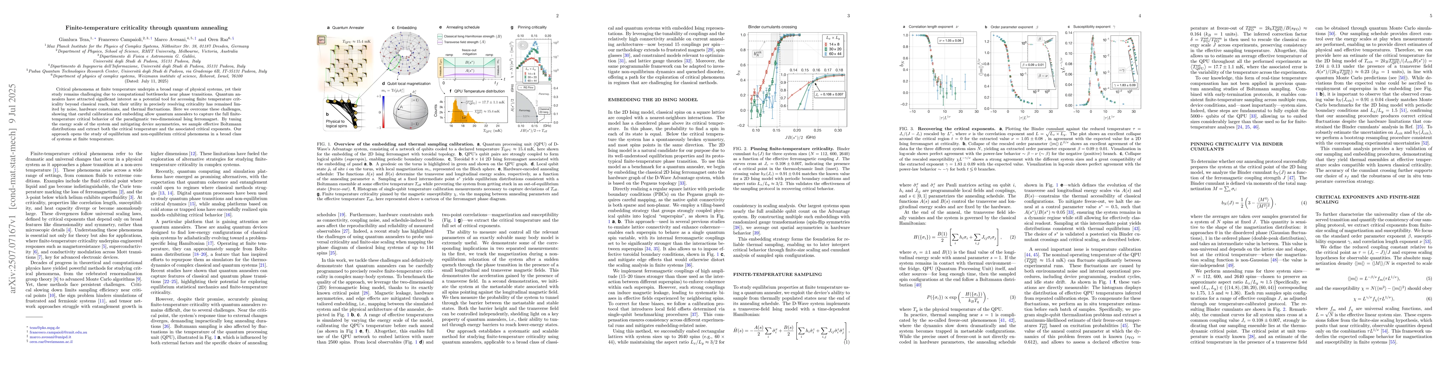 Critical phenomena at finite temperature underpin a broad range of physical systems, yet their study remains challenging due to computational bottlenecks near phase transitions. Quantum annealers have attracted significant interest as a potential tool for accessing finite temperature criticality beyond classical reach, but their utility in precisely resolving criticality has remained limited by noise, hardware constraints, and thermal fluctuations. Here we overcome these challenges, showing that careful calibration and embedding allow quantum annealers to capture the full finite-temperature critical behavior of the paradigmatic two-dimensional Ising ferromagnet. By tuning the energy scale of the system and mitigating device asymmetries, we sample effective Boltzmann distributions and extract both the critical temperature and the associated critical exponents. Our approach opens the study of equilibrium and non-equilibrium critical phenomena in a broad class of systems at finite temperature.