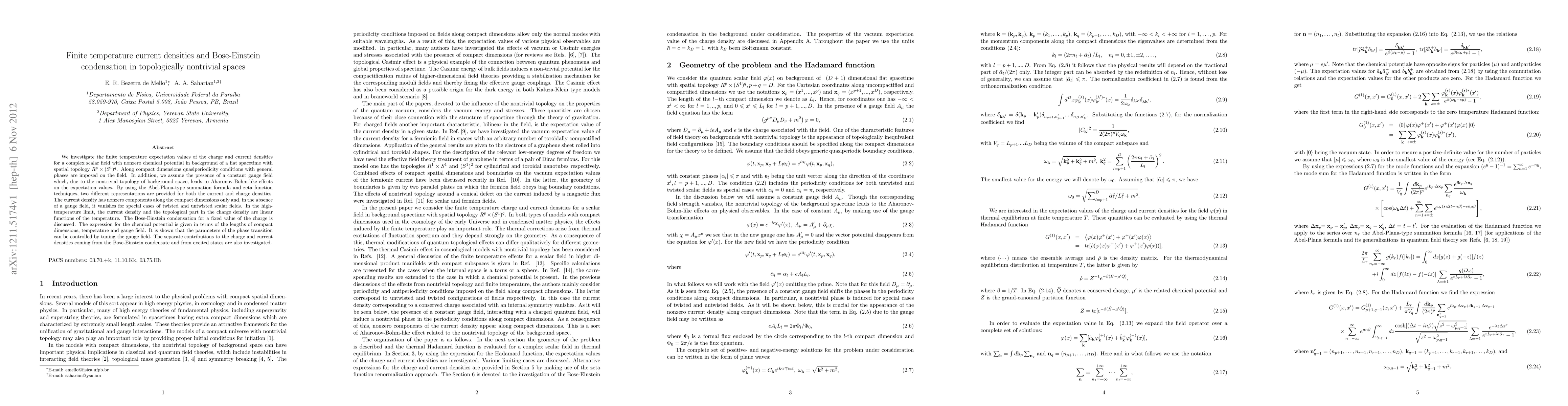 This paper explores finite temperature charge and current densities for a complex scalar field in a topologically nontrivial space with spatial topology $R^{p}\times (S^{1})^{q}$, revealing Aharonov-Bohm-like effects and discussing Bose-Einstein condensation, with the phase transition parameters controlled by the gauge field.