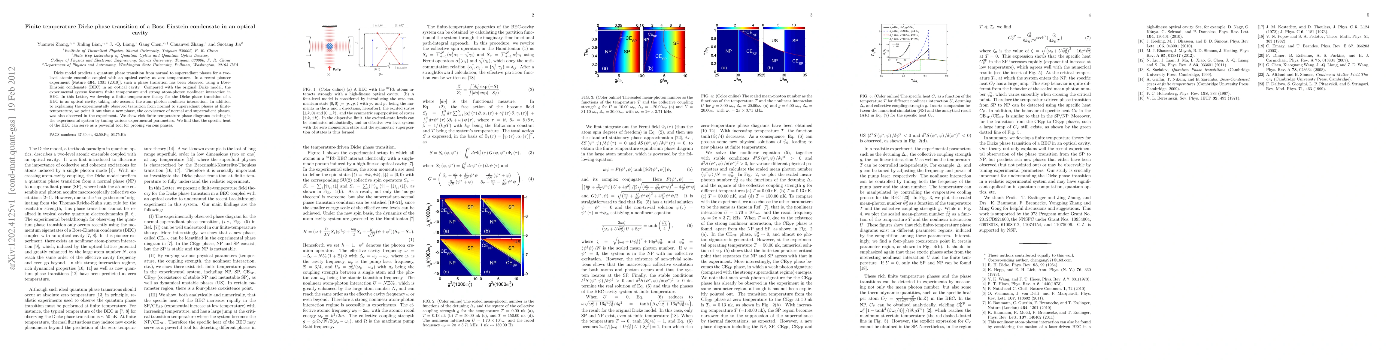 This research develops a finite temperature theory for the Dicke phase transition in a Bose-Einstein condensate within an optical cavity, highlighting a new coexistence phase alongside normal and superradiant phases. The study uses specific heat as a probe for phase transitions and reveals complex phase diagrams by varying experimental parameters.
