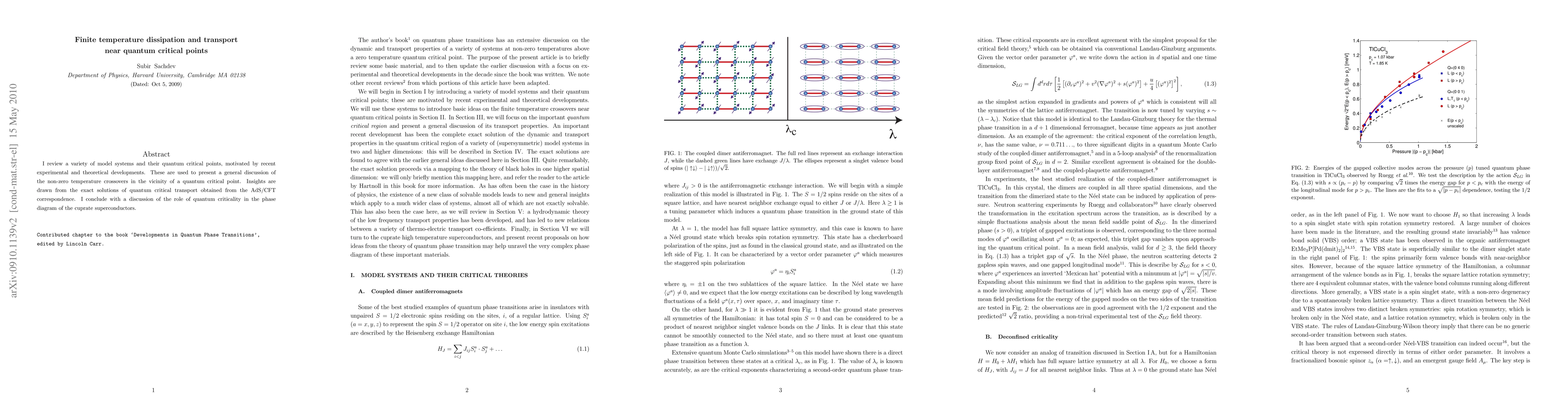 I review a variety of model systems and their quantum critical points, motivated by recent experimental and theoretical developments. These are used to present a general discussion of the non-zero temperature crossovers in the vicinity of a quantum critical point. Insights are drawn from the exact solutions of quantum critical transport obtained from the AdS/CFT correspondence. I conclude with a discussion of the role of quantum criticality in the phase diagram of the cuprate superconductors