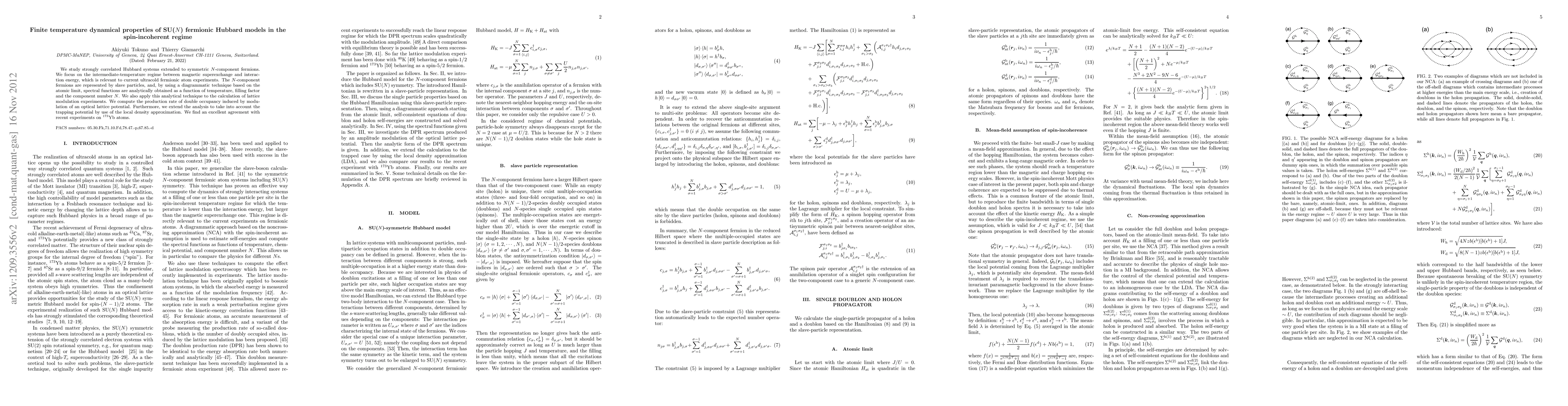 We study strongly correlated Hubbard systems extended to symmetric $N$-component fermions. We focus on the intermediate-temperature regime between magnetic superexchange and interaction energy, which is relevant to current ultracold fermionic atom experiments. The $N$-component fermions are represented by slave particles, and, by using a diagrammatic technique based on the atomic limit, spectral functions are analytically obtained as a function of temperature, filling factor and the component number $N$. We also apply this analytical technique to the calculation of lattice modulation experiments. We compute the production rate of double occupancy induced by modulation of an optical lattice potential. Furthermore, we extend the analysis to take into account the trapping potential by use of the local density approximation. We find an excellent agreement with recent experiments on $^{173}$Yb atoms.