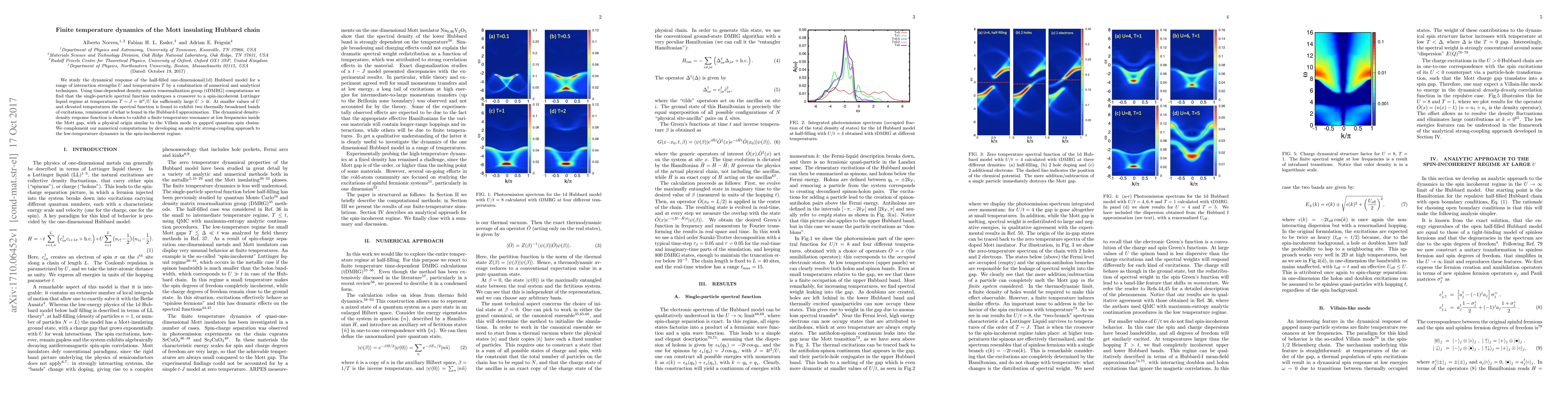 We study the dynamical response of the half-filled one-dimensional(1d) Hubbard model for a range of interaction strengths $U$ and temperatures $T$ by a combination of numerical and analytical techniques. Using time-dependent density matrix renormalization group (tDMRG) computations we find that the single-particle spectral function undergoes a crossover to a spin-incoherent Luttinger liquid regime at temperatures $T \sim J=4t^2/U$ for sufficiently large $U > 4t$. At smaller values of $U$ and elevated temperatures the spectral function is found to exhibit two thermally broadened bands of excitations, reminiscent of what is found in the Hubbard-I approximation. The dynamical density-density response function is shown to exhibit a finite temperature resonance at low frequencies inside the Mott gap, with a physical origin similar to the Villain mode in gapped quantum spin chains. We complement our numerical computations by developing an analytic strong-coupling approach to the low-temperature dynamics in the spin-incoherent regime.