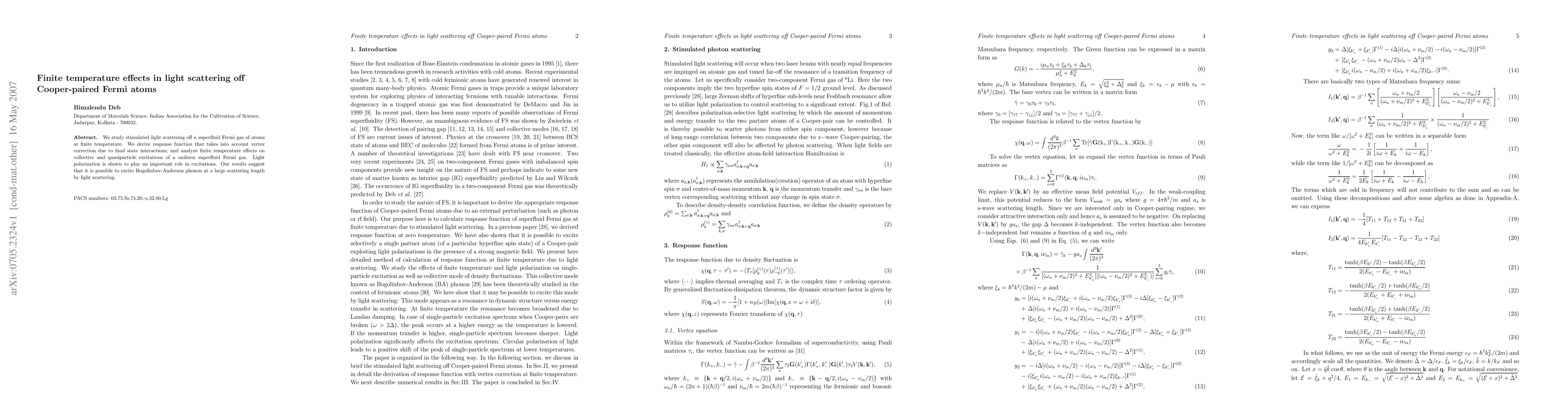 We study stimulated light scattering off a superfluid Fermi gas of atoms at finite temperature. We derive response function that takes into account vertex correction due to final state interactions; and analyze finite temperature effects on collective and quasiparticle excitations of a uniform superfluid Fermi gas. Light polarization is shown to play an important role in excitations. Our results suggest that it is possible to excite Bogoliubov-Anderson phonon at a large scattering length by light scattering.