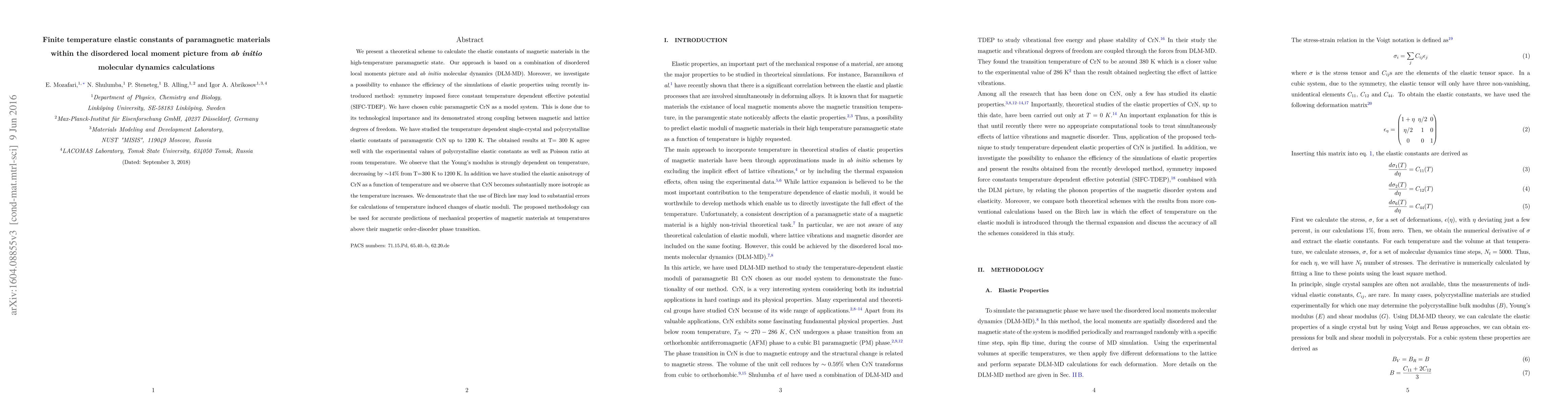 This paper presents a theoretical framework combining disordered local moments and ab initio molecular dynamics to calculate elastic constants of paramagnetic materials, specifically cubic paramagnetic CrN. The study reveals significant temperature-dependent changes in Young's modulus and elastic anisotropy, highlighting the importance of accurate methodologies for predicting mechanical properties in magnetic materials above their magnetic phase transition.