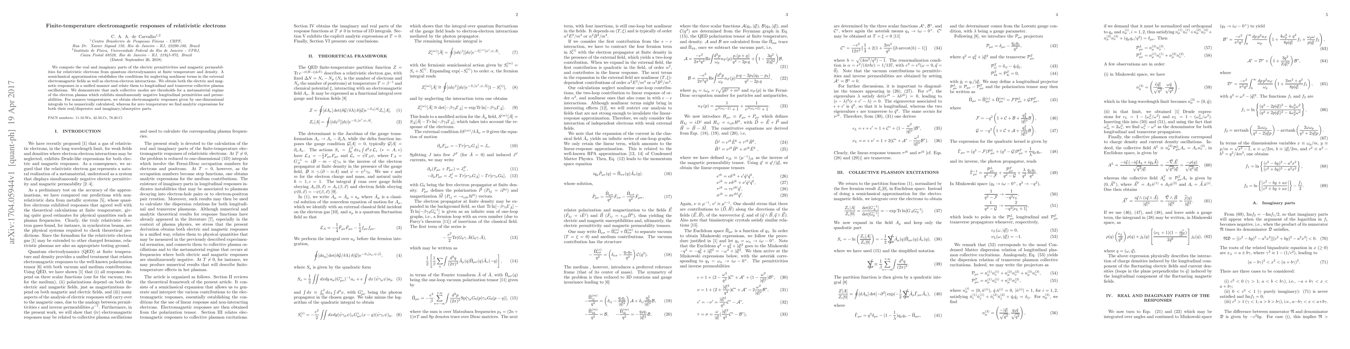 This paper computes the electromagnetic responses of relativistic electrons at finite temperature and density using quantum electrodynamics, revealing conditions for neglecting nonlinear terms and electron-electron interactions. It unifies electric and magnetic responses, linking them to plasma oscillations and identifying thresholds for a metamaterial regime with negative permittivities and permeabilities.