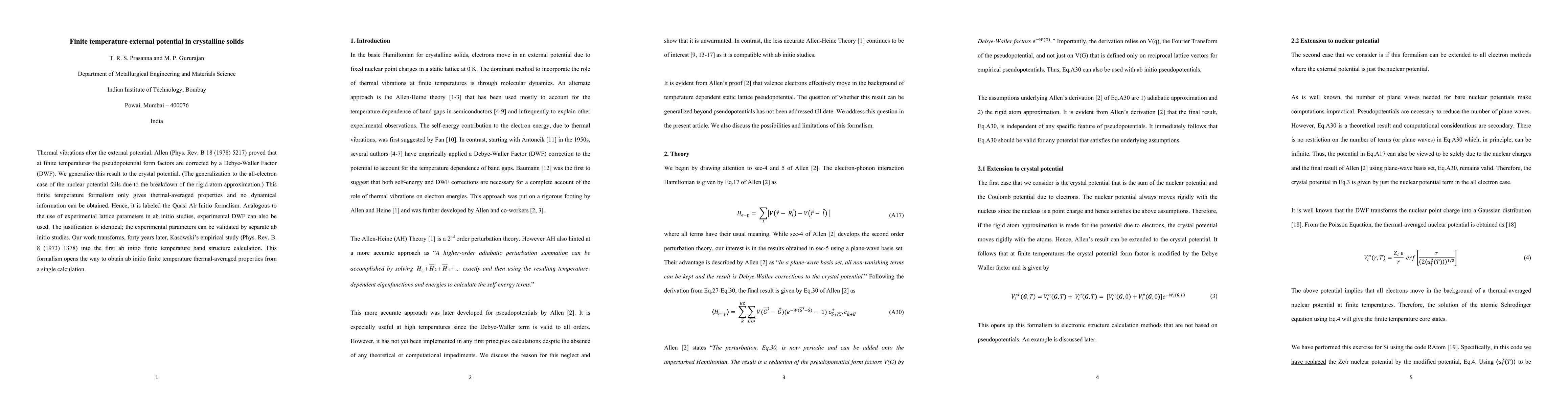 Thermal vibrations alter the external potential. Allen (Phys. Rev. B 18 (1978) 5217) proved that at finite temperatures the pseudopotential form factors are corrected by a Debye-Waller Factor (DWF). We generalize this result to the crystal potential. (The generalization to the all-electron case of the nuclear potential fails due to the breakdown of the rigid-atom approximation.) This finite temperature formalism only gives thermal-averaged properties and no dynamical information can be obtained. Hence, it is labeled the Quasi Ab Initio formalism. Analogous to the use of experimental lattice parameters in ab initio studies, experimental DWF can also be used. The justification is identical; the experimental parameters can be validated by separate ab initio studies. Our work transforms, forty years later, Kasowski's empirical study (Phys. Rev. B. 8 (1973) 1378) into the first ab initio finite temperature band structure calculation. This formalism opens the way to obtain ab initio finite temperature thermal-averaged properties from a single calculation.