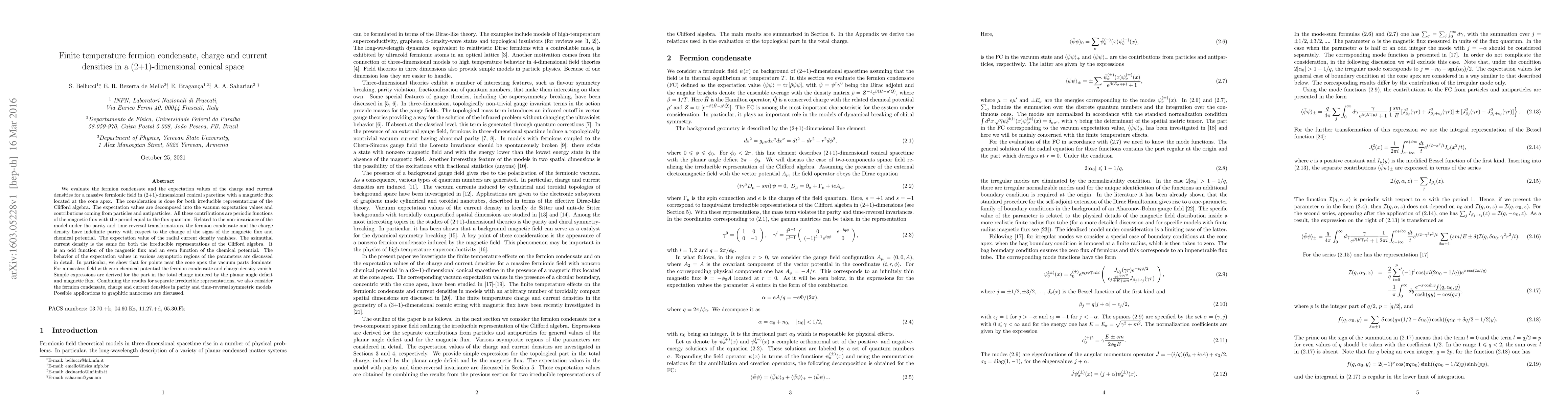 This paper evaluates the fermion condensate and charge and current densities in (2+1)-dimensional conical spacetime with a magnetic flux at the cone apex. It finds that these quantities are periodic functions with a period equal to the flux quantum, and discusses their behavior in various parameter regions, particularly highlighting the dominance of vacuum parts near the cone apex.
