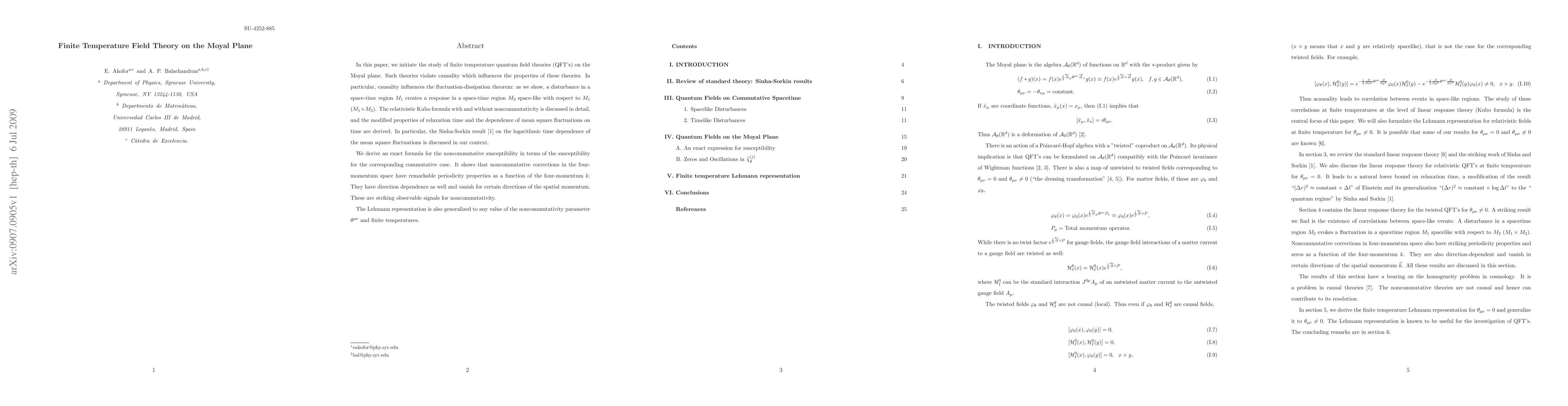 In this paper, we initiate the study of finite temperature quantum field theories (QFT's) on the Moyal plane. Such theories violate causality which influences the properties of these theories. In particular, causality influences the fluctuation-dissipation theorem: as we show, a disturbance in a space-time region $M_1$ creates a response in a space-time region $M_2$ space-like with respect to $M_1$ ($M_1\times M_2$). The relativistic Kubo formula with and without noncommutativity is discussed in detail, and the modified properties of relaxation time and the dependence of mean square fluctuations on time are derived. In particular, the Sinha-Sorkin result \cite{sorkin-sinha} on the logarithmic time dependence of the mean square fluctuations is discussed in our context. We derive an exact formula for the noncommutative susceptibility in terms of the susceptibility for the corresponding commutative case. It shows that noncommutative corrections in the four-momentum space have remarkable periodicity properties as a function of the four-momentum $k$. They have direction dependence as well and vanish for certain directions of the spatial momentum. These are striking observable signals for noncommutativity. The Lehmann representation is also generalized to any value of the noncommutativity parameter $\theta^{\mu\nu}$ and finite temperatures.