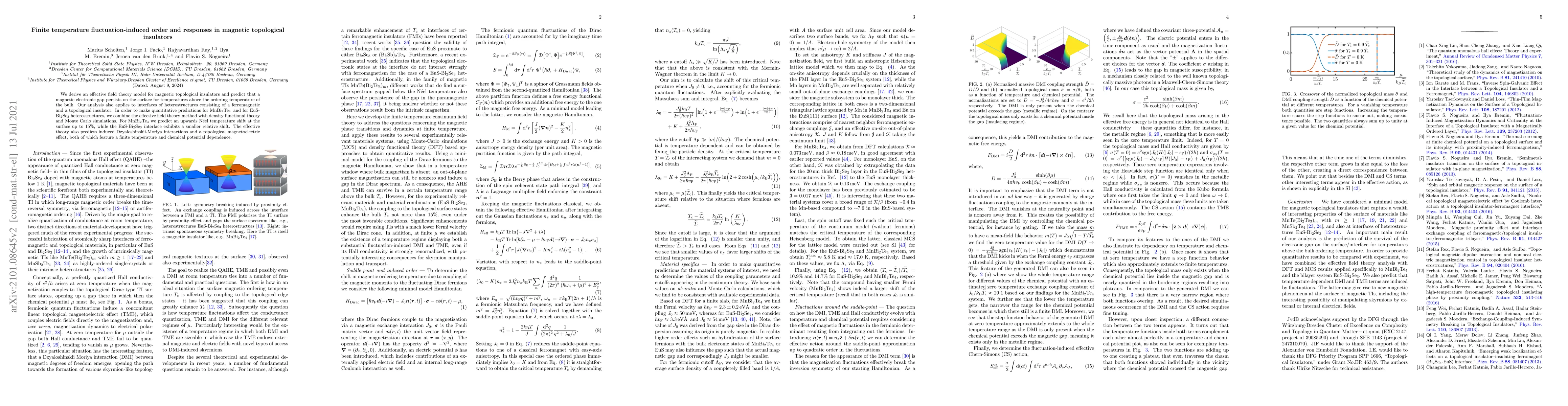 This paper develops an effective field theory model for magnetic topological insulators, predicting that a magnetic electronic gap remains on the surface above the bulk's ordering temperature. It combines this theory with density functional and Monte Carlo simulations to predict specific temperature shifts and interactions in materials like MnBi$_2$Te$_4$ and EuS-Bi$_2$Se$_3$, including an upwards N\'eel temperature shift and induced topological effects.