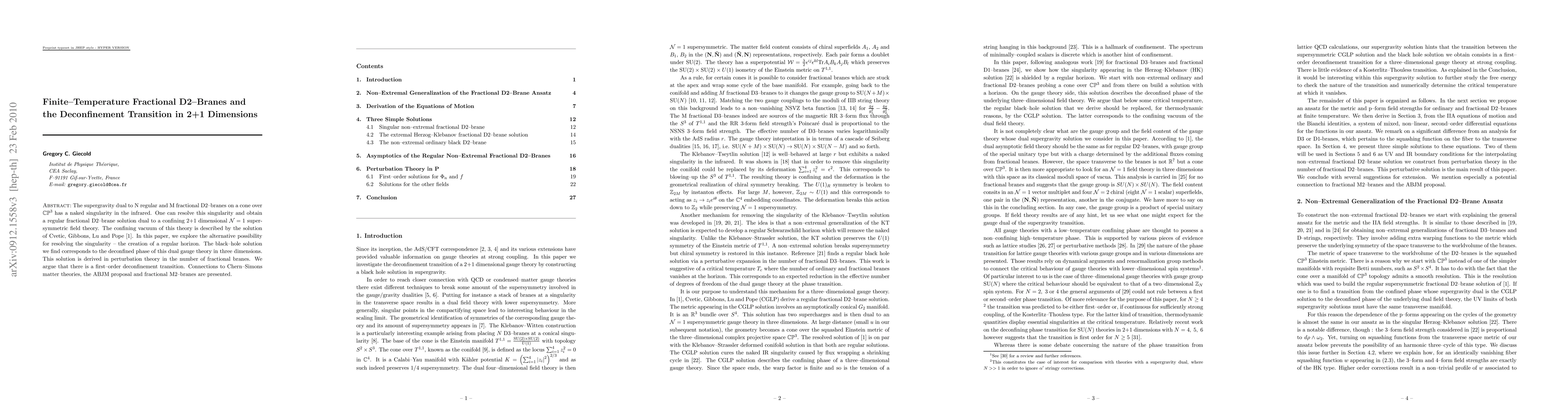 Researchers explored a new solution to resolve the singularity of N fractional D2-branes in 2+1 dimensions, finding a regular horizon that corresponds to the deconfined phase of a dual gauge theory, suggesting a first-order deconfinement transition.