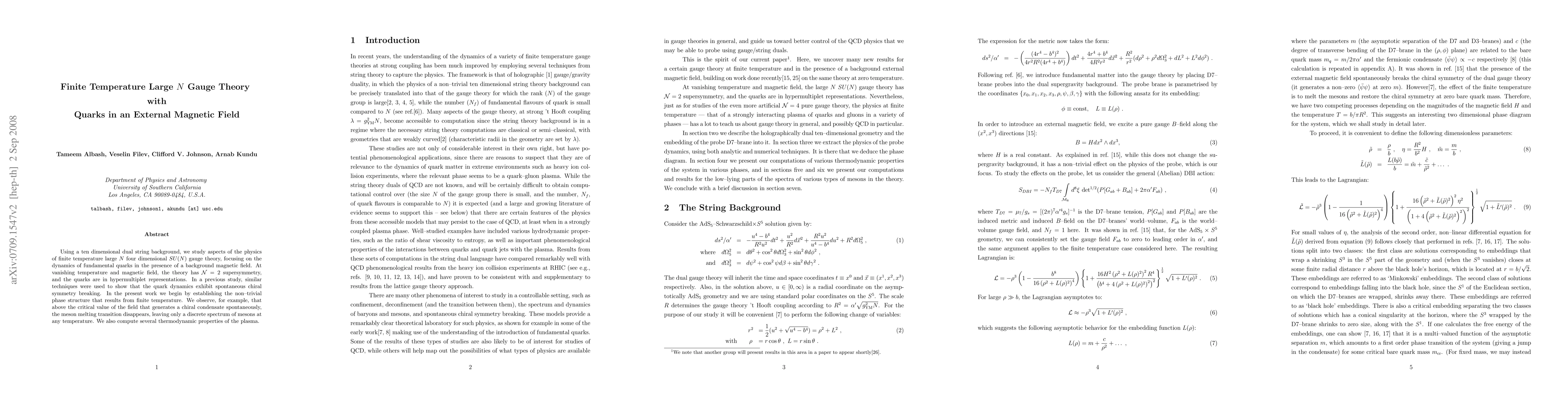 Using a ten dimensional dual string background, we study aspects of the physics of finite temperature large N four dimensional SU(N) gauge theory, focusing on the dynamics of fundamental quarks in the presence of a background magnetic field. At vanishing temperature and magnetic field, the theory has N=2 supersymmetry, and the quarks are in hypermultiplet representations. In a previous study, similar techniques were used to show that the quark dynamics exhibit spontaneous chiral symmetry breaking. In the present work we begin by establishing the non-trivial phase structure that results from finite temperature. We observe, for example, that above the critical value of the field that generates a chiral condensate spontaneously, the meson melting transition disappears, leaving only a discrete spectrum of mesons at any temperature. We also compute several thermodynamic properties of the plasma.