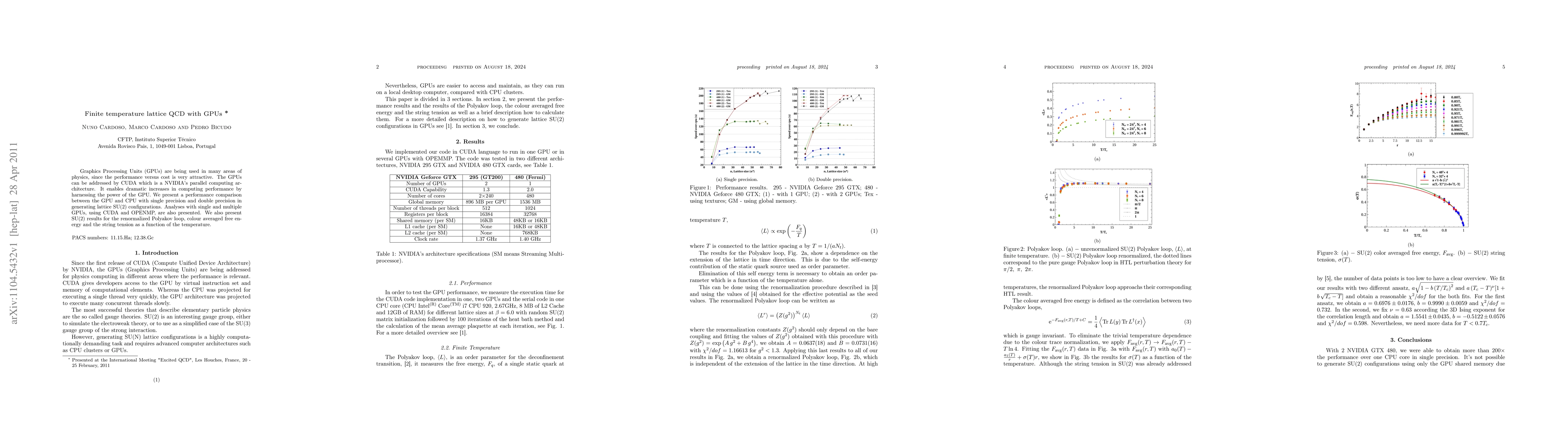 Graphics Processing Units (GPUs) are being used in many areas of physics, since the performance versus cost is very attractive. The GPUs can be addressed by CUDA which is a NVIDIA's parallel computing architecture. It enables dramatic increases in computing performance by harnessing the power of the GPU. We present a performance comparison between the GPU and CPU with single precision and double precision in generating lattice SU(2) configurations. Analyses with single and multiple GPUs, using CUDA and OPENMP, are also presented. We also present SU(2) results for the renormalized Polyakov loop, colour averaged free energy and the string tension as a function of the temperature.