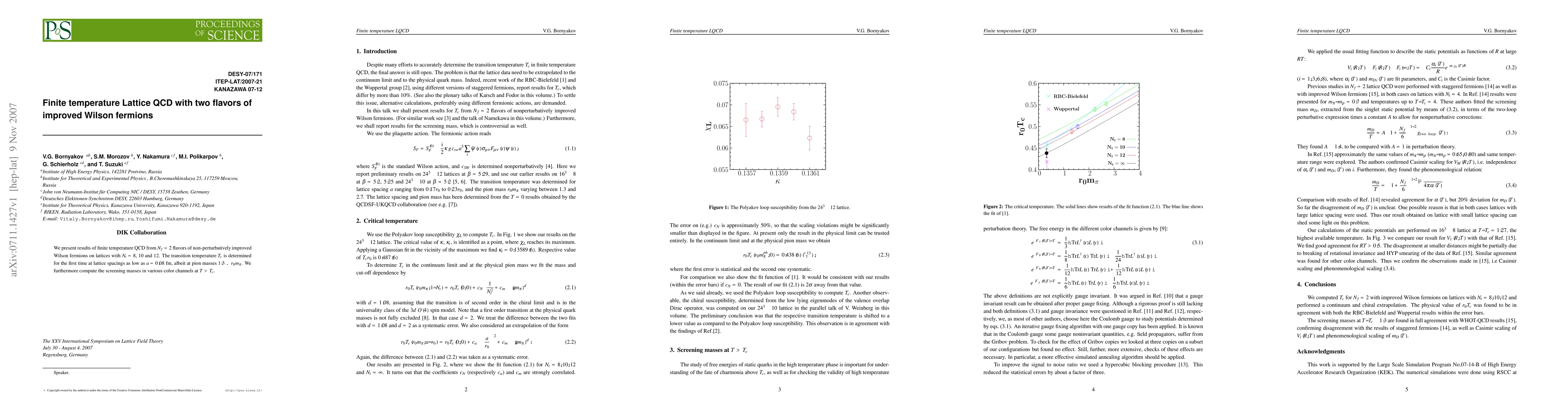 This paper reports on finite temperature QCD simulations using two flavors of non-perturbatively improved Wilson fermions, determining the transition temperature T_c at low lattice spacings, and calculating screening masses in various color channels above T_c. The study employs lattices with temporal extents N_t=8, 10, and 12.
