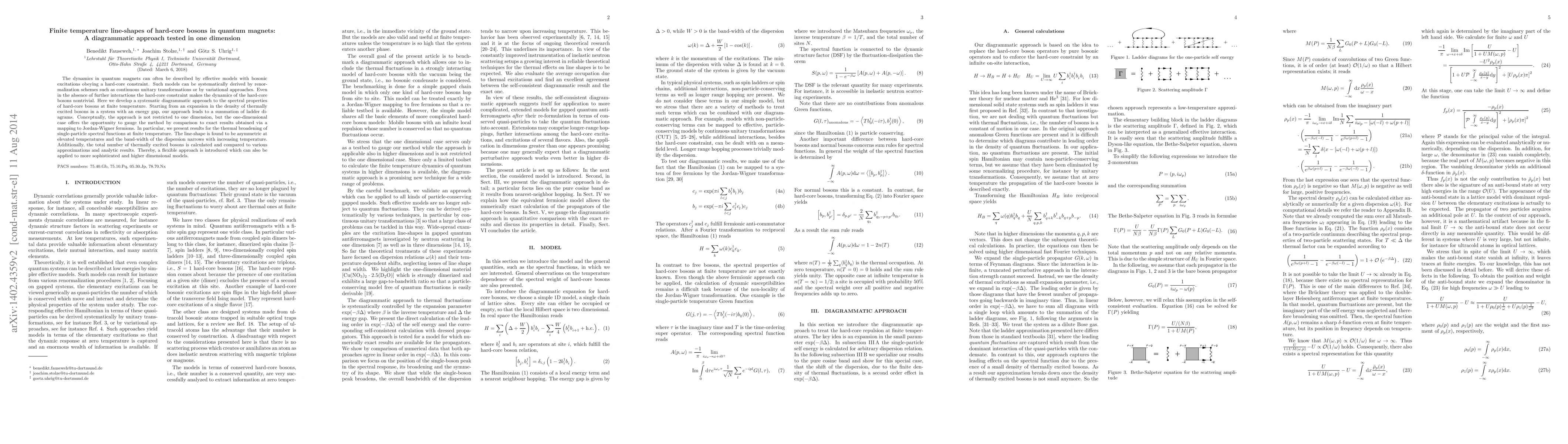 This paper develops a systematic diagrammatic approach to study the spectral properties of hard-core bosons in quantum magnets at finite temperature, focusing on one-dimensional systems for validation against exact results. The method reveals asymmetric thermal broadening and narrowing bandwidth with increasing temperature, alongside a comparison of the total number of thermally excited bosons with various approximations.