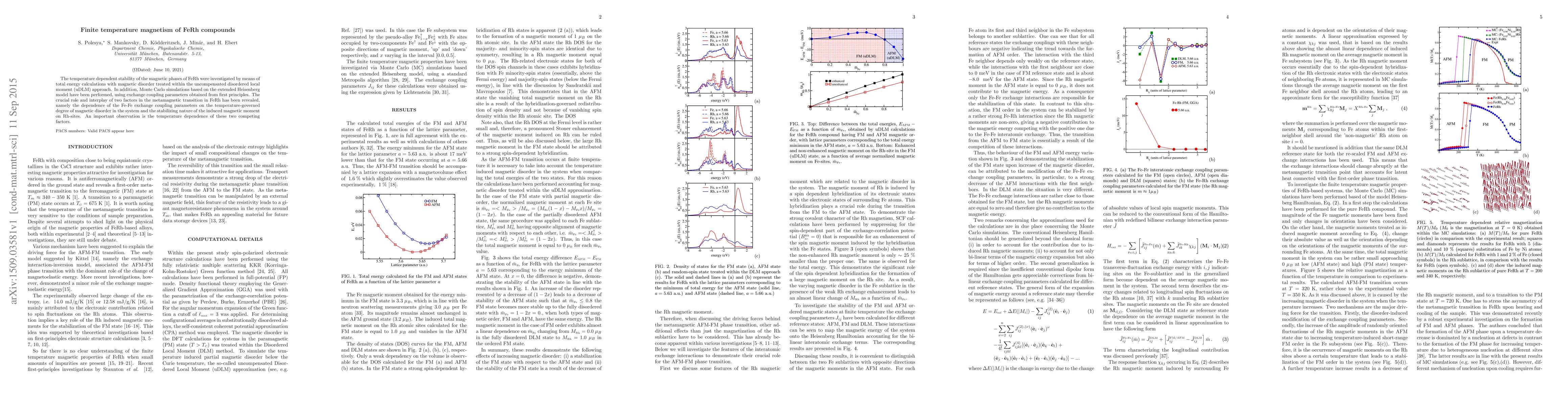 This study investigates the magnetic phases of FeRh at finite temperatures using total energy calculations and Monte Carlo simulations. It reveals that the metamagnetic transition in FeRh is influenced by the temperature-dependent Fe-Fe exchange coupling and the stabilizing induced magnetic moment on Rh-sites, highlighting their interplay and competition.