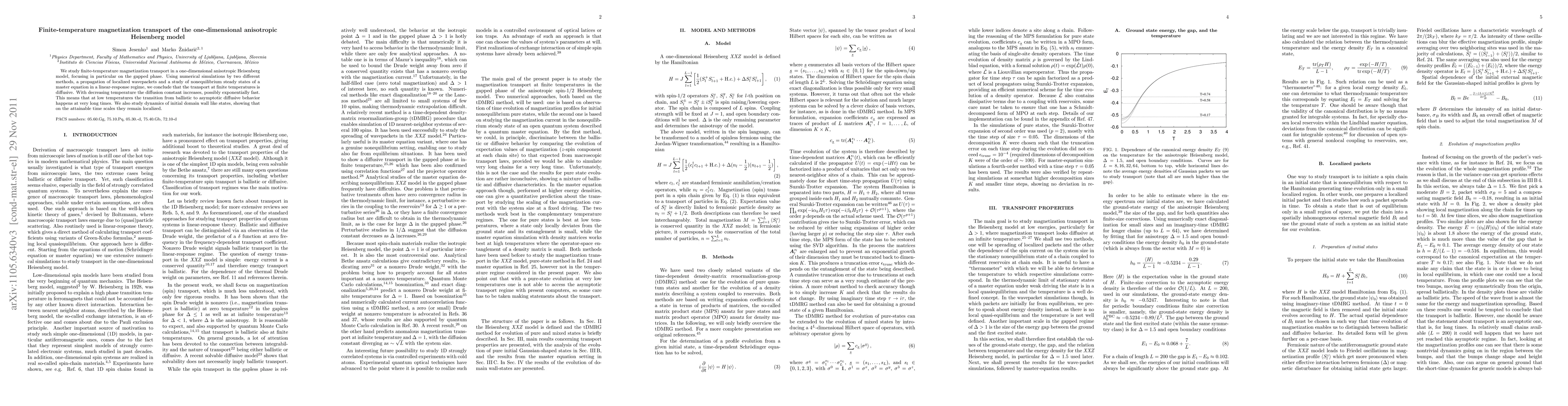 This paper investigates the finite-temperature magnetization transport in a one-dimensional anisotropic Heisenberg model, finding diffusive behavior with increasing diffusion constant at lower temperatures. Numerical simulations reveal that initial domain wall states remain localized on measurable timescales.
