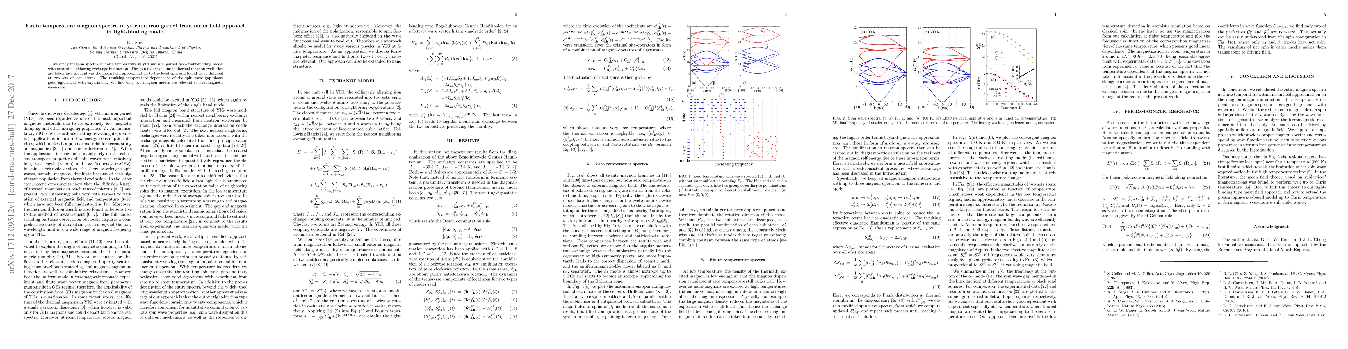 This paper investigates finite temperature magnon spectra in yttrium iron garnet using a tight-binding model with mean field approximation, revealing distinct spin reduction effects on two sets of iron atoms and identifying two relevant magnon modes for ferromagnetic resonance, with temperature-dependent spin wave gap matching experimental results.