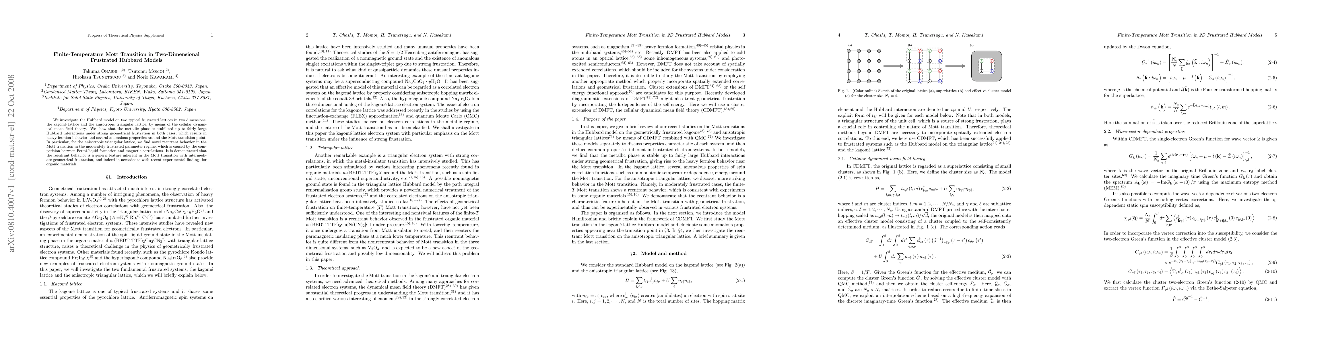 This study uses cellular dynamical mean field theory to explore the finite-temperature Mott transition in two-dimensional frustrated Hubbard models on kagome and anisotropic triangular lattices, revealing heavy fermion behavior and novel reentrant transition phenomena driven by the interplay of Fermi-liquid and magnetic correlations.