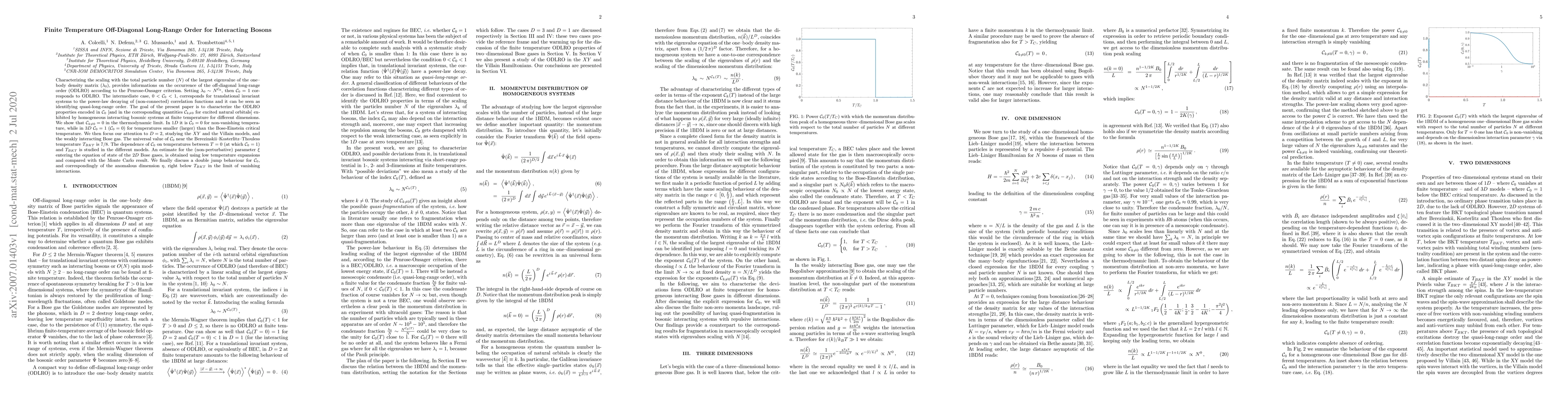 Researchers investigated finite temperature off-diagonal long-range order in interacting bosons, finding that in 2D systems the value of C0 near the Berezinskii-Kosterlitz-Thouless temperature is 7/8, with a double jump behavior below T_BKT.