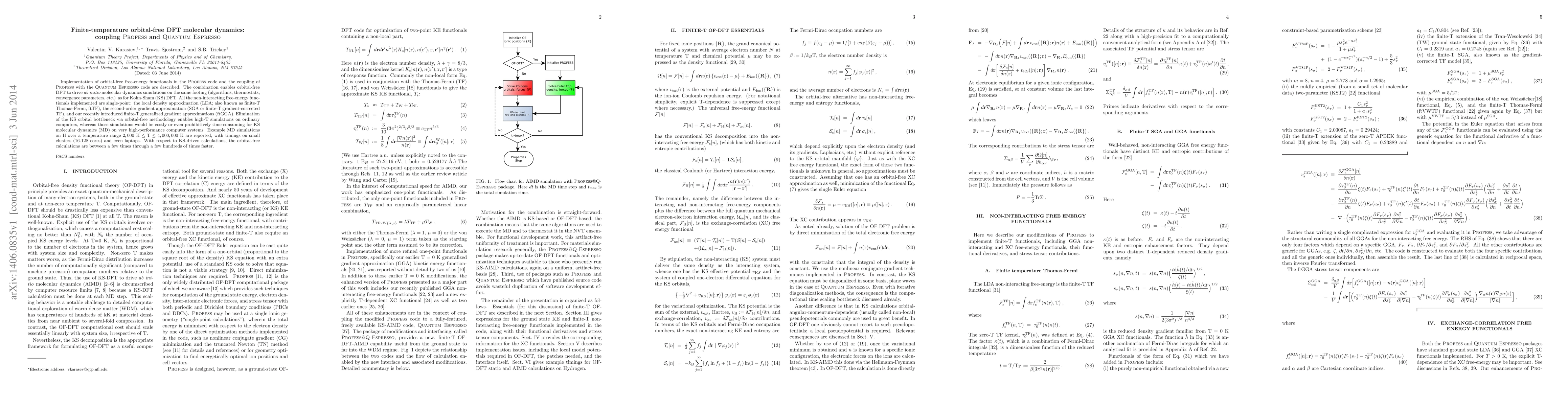 Implementation of orbital-free free-energy functionals in the Profess code and the coupling of Profess with the Quantum Espresso code are described. The combination enables orbital-free DFT to drive ab initio molecular dynamics simulations on the same footing (algorithms, thermostats, convergence parameters, etc.) as for Kohn-Sham (KS) DFT. All the non-interacting free-energy functionals implemented are single-point: the local density approximation (LDA; also known as finite-T Thomas-Fermi, ftTF), the second-order gradient approximation (SGA or finite-T gradient-corrected TF), and our recently introduced finite-T generalized gradient approximations (ftGGA). Elimination of the KS orbital bottleneck via orbital-free methodology enables high-T simulations on ordinary computers, whereas those simulations would be costly or even prohibitively time-consuming for KS molecular dynamics (MD) on very high-performance computer systems. Example MD simulations on H over a temperature range 2,000 K <= T <=4,000,000 K are reported, with timings on small clusters (16-128 cores) and even laptops. With respect to KS-driven calculations, the orbital-free calculations are between a few times through a few hundreds of times faster.