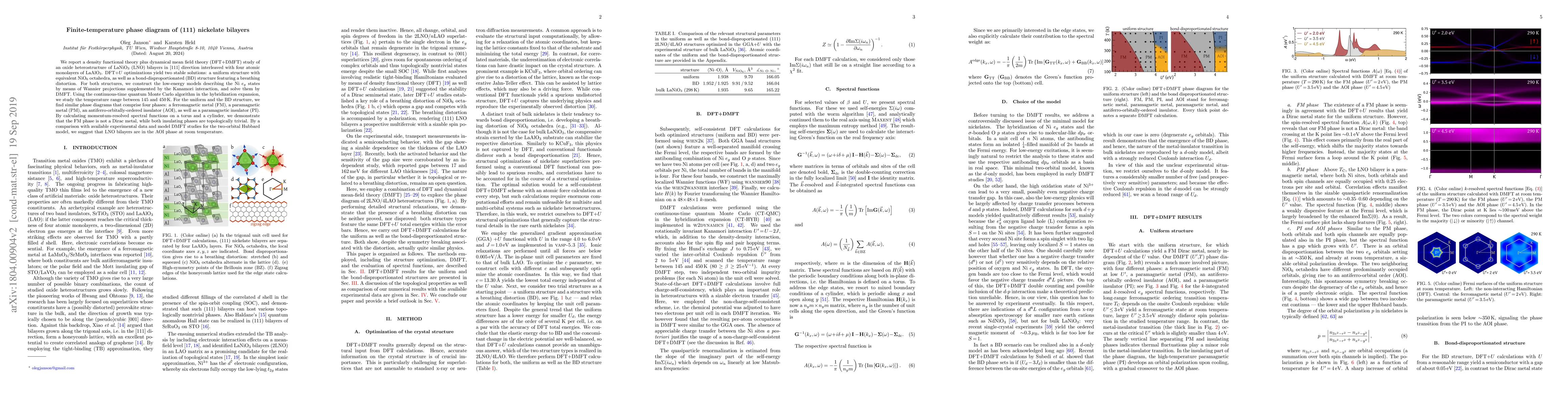 We report a density functional theory plus dynamical mean field theory (DFT+DMFT) study of an oxide heterostructure of LaNiO$_3$ (LNO) bilayers in [111] direction interleaved with four atomic monolayers of LaAlO$_3$. DFT+$U$ optimizations yield two stable solutions: a uniform structure with equivalent NiO$_6$ octahedra, as well as a bond-disproportionated (BD) structure featuring a breathing distortion. For both structures, we construct the low-energy models describing the Ni $e_g$ states by means of Wannier projections supplemented by the Kanamori interaction, and solve them by DMFT. Using the continuous-time quantum Monte Carlo algorithm in the hybridization expansion, we study the temperature range between 145 and 450 K. For the uniform and the BD structure, we find similar phase diagrams that comprise four phases: a ferromagnetic metal (FM), a paramagnetic metal (PM), an antiferro-orbitally-ordered insulator (AOI), as well as a paramagnetic insulator (PI). By calculating momentum-resolved spectral functions on a torus and a cylinder, we demonstrate that the FM phase is not a Dirac metal, while both insulating phases are topologically trivial. By a comparison with available experimental data and model DMFT studies for the two-orbital Hubbard model, we suggest that LNO bilayers are in the AOI phase at room temperature.