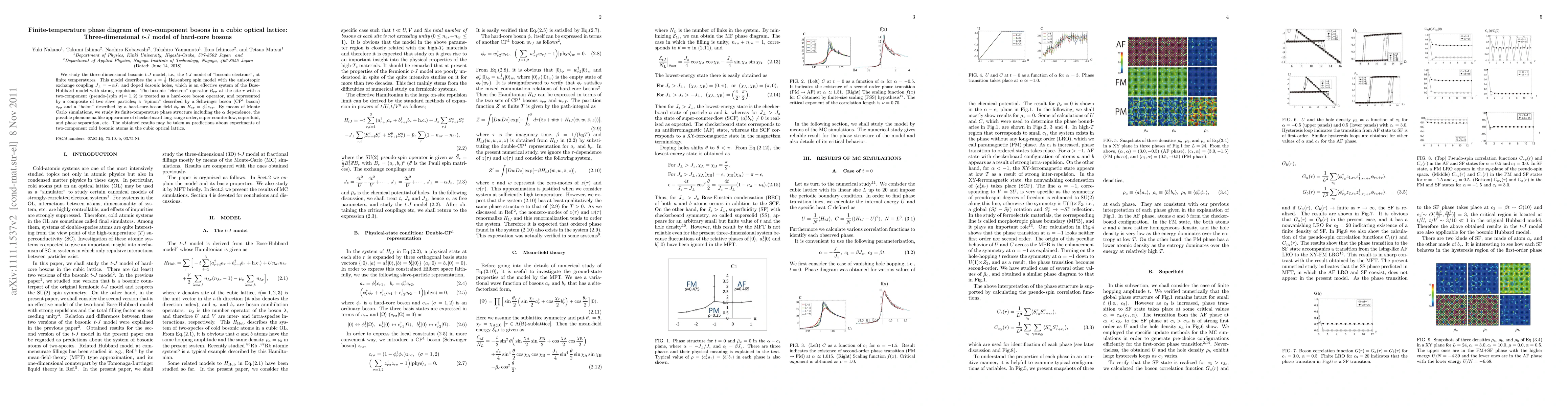 We study the three-dimensional bosonic t-J model, i.e., the t-J model of "bosonic electrons", at finite temperatures. This model describes the $s={1 \over 2}$ Heisenberg spin model with the anisotropic exchange coupling $J_{\bot}=-\alpha J_z$ and doped {\it bosonic} holes, which is an effective system of the Bose-Hubbard model with strong repulsions. The bosonic "electron" operator $B_{r\sigma}$ at the site $r$ with a two-component (pseudo-)spin $\sigma (=1,2)$ is treated as a hard-core boson operator, and represented by a composite of two slave particles; a "spinon" described by a Schwinger boson (CP$^1$ boson) $z_{r\sigma}$ and a "holon" described by a hard-core-boson field $\phi_r$ as $B_{r\sigma}=\phi^\dag_r z_{r\sigma}$. By means of Monte Carlo simulations, we study its finite-temperature phase structure including the $\alpha$ dependence, the possible phenomena like appearance of checkerboard long-range order, super-counterflow, superfluid, and phase separation, etc. The obtained results may be taken as predictions about experiments of two-component cold bosonic atoms in the cubic optical lattice.