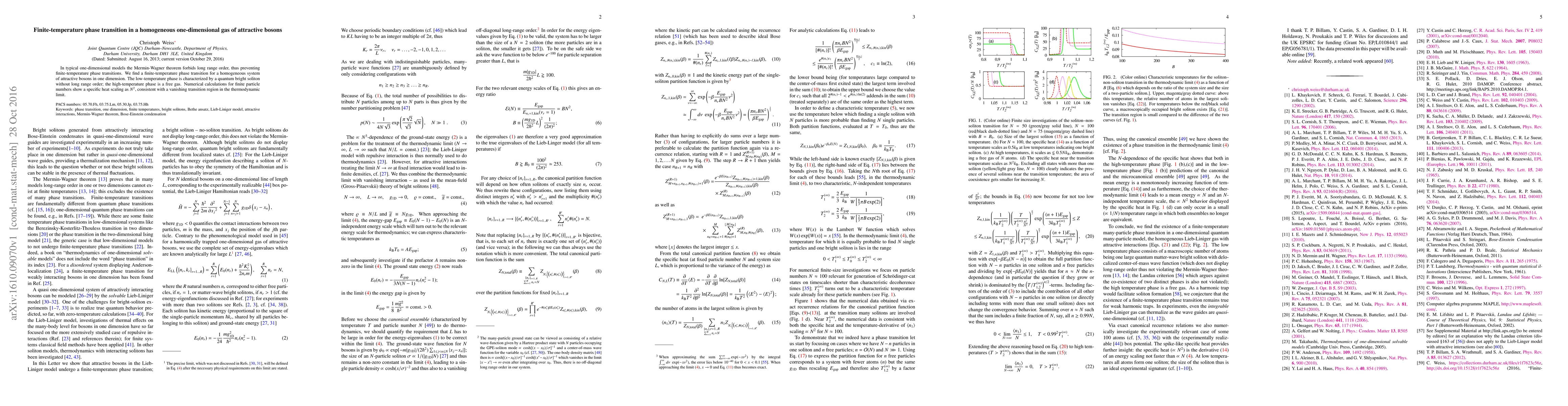 In typical one-dimensional models the Mermin-Wagner theorem forbids long range order, thus preventing finite-temperature phase transitions. We find a finite-temperature phase transition for a homogeneous system of attractive bosons in one dimension. The low-temperature phase is characterized by a quantum bright soliton without long range order; the high-temperature phase is a free gas. Numerical calculations for finite particle numbers show a specific heat scaling as $N^2$, consistent with a vanishing transition region in the thermodynamic limit.