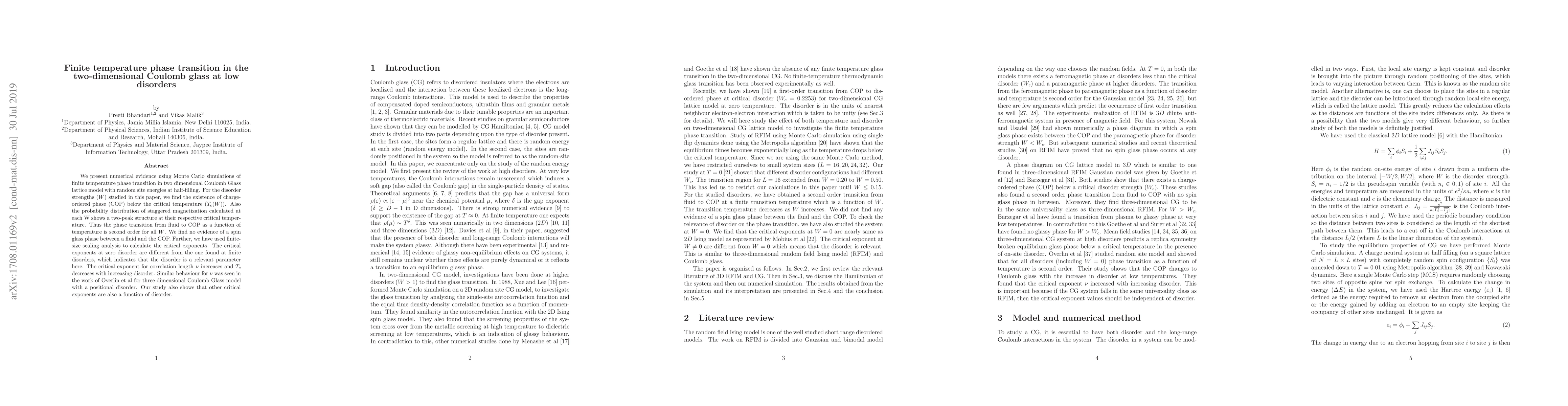 This paper reports numerical evidence of a finite-temperature phase transition in a two-dimensional Coulomb Glass lattice model, revealing a charge-ordered phase below a critical temperature. The study finds no spin glass phase and indicates that disorder is a relevant parameter affecting critical exponents, with $\nu$ increasing and $T_{c}$ decreasing with higher disorder.