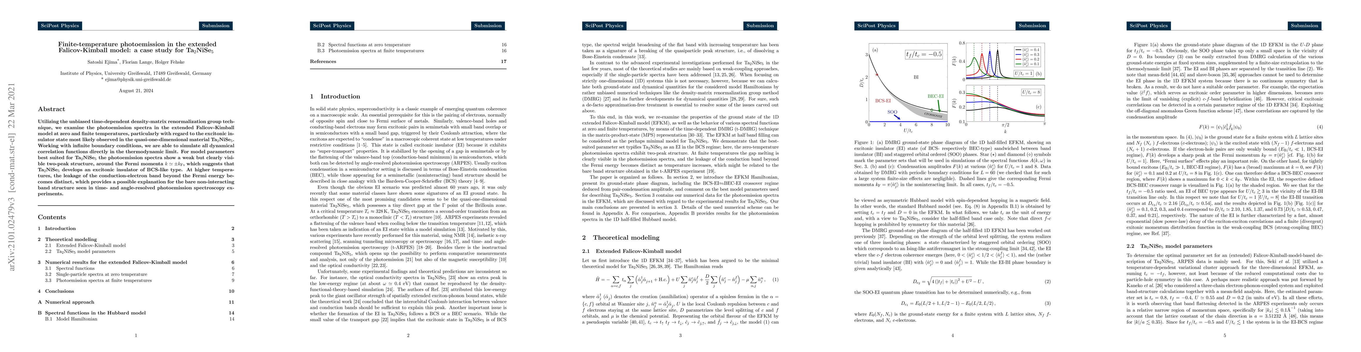 Utilizing the unbiased time-dependent density-matrix renormalization group technique, we examine the photoemission spectra in the extended Falicov-Kimball model at zero and finite temperatures, particularly with regard to the excitonic insulator state most likely observed in the quasi-one-dimensional material Ta$_2$NiSe$_5$. Working with infinite boundary conditions, we are able to simulate all dynamical correlation functions directly in the thermodynamic limit. For model parameters best suited for Ta$_2$NiSe$_5$ the photoemission spectra show a weak but clearly visible two-peak structure, around the Fermi momenta $k\simeq\pm k_{\rm F}$, which suggests that Ta$_2$NiSe$_5$ develops an excitonic insulator of BCS-like type. At higher temperatures, the leakage of the conduction-electron band beyond the Fermi energy becomes distinct, which provides a possible explanation for the bare non-interacting band structure seen in time- and angle-resolved photoemission spectroscopy experiments.