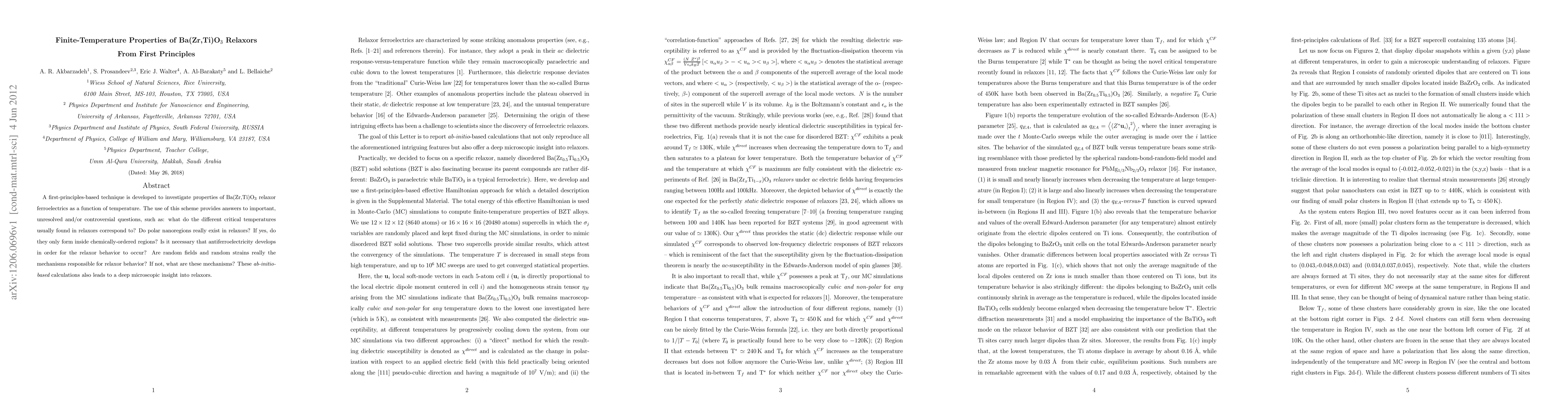 A first-principles-based technique is developed to investigate properties of Ba(Zr,Ti)O$_3$ relaxor ferroelectrics as a function of temperature. The use of this scheme provides answers to important, unresolved and/or controversial questions, such as: what do the different critical temperatures usually found in relaxors correspond to? Do polar nanoregions really exist in relaxors? If yes, do they only form inside chemically-ordered regions? Is it necessary that antiferroelectricity develops in order for the relaxor behavior to occur? Are random fields and random strains really the mechanisms responsible for relaxor behavior? If not, what are these mechanisms? These {\it ab-initio-based} calculations also leads to a deep microscopic insight into relaxors.