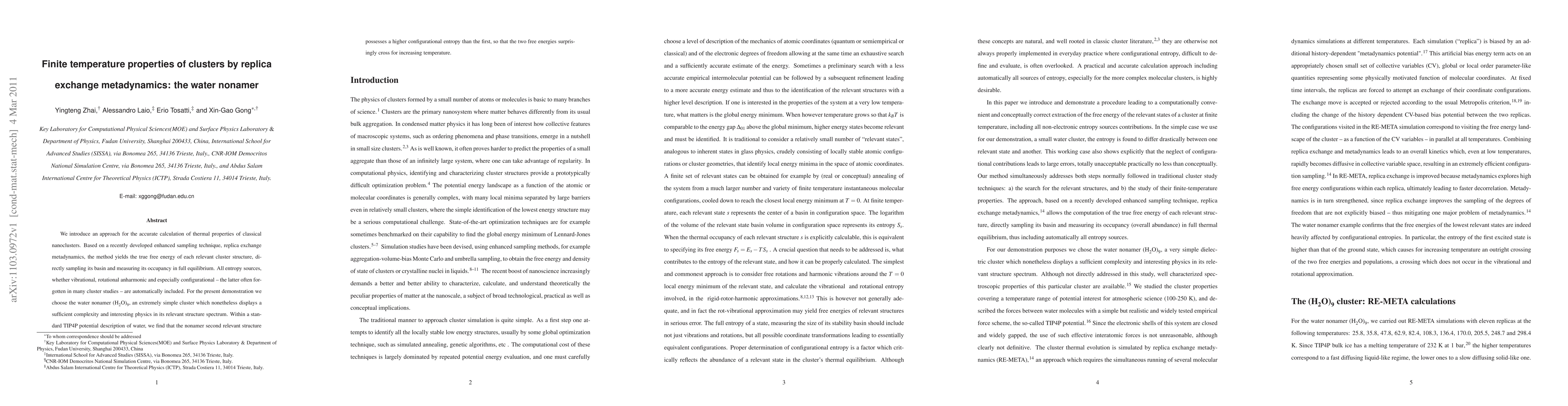 This paper presents an enhanced sampling technique using replica exchange metadynamics to accurately calculate the thermal properties of classical nanoclusters. The method reveals that the water nonamer's second relevant structure has higher configurational entropy, leading to a surprising crossover in free energies with increasing temperature.