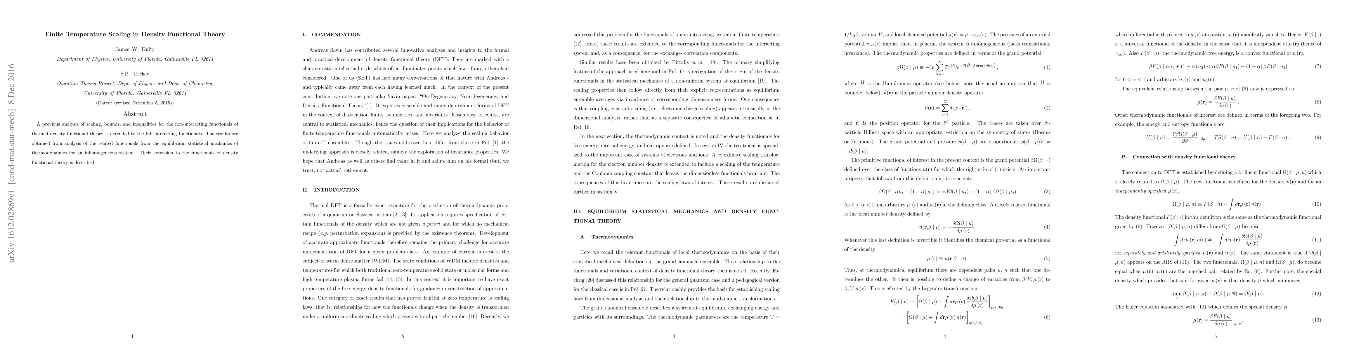 This paper extends previous analyses of scaling, bounds, and inequalities for non-interacting thermal density functional theory to interacting functionals, utilizing equilibrium statistical mechanics of thermodynamics for inhomogeneous systems to describe the extension to density functional theory.