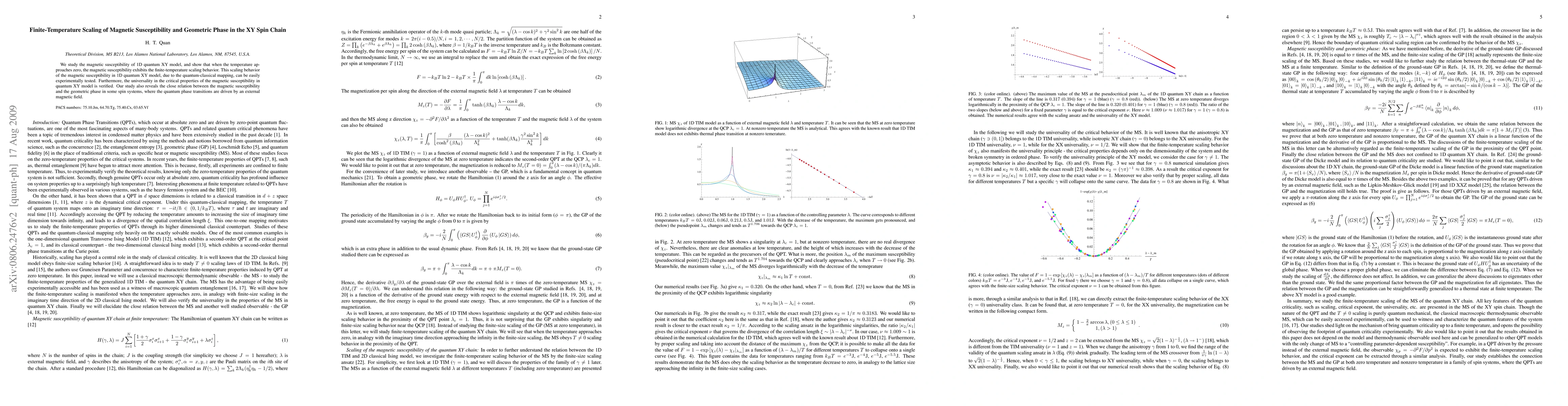 This paper investigates the magnetic susceptibility in the 1D quantum XY model and demonstrates finite-temperature scaling behavior as temperature approaches zero. It also verifies the universality of critical properties and reveals a connection between magnetic susceptibility and geometric phase in spin systems undergoing quantum phase transitions.
