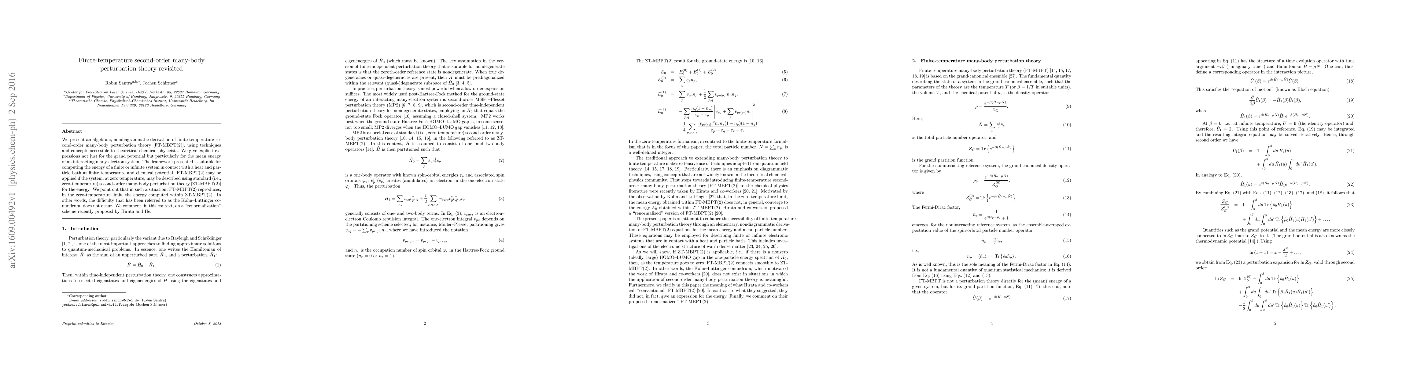 We present an algebraic, nondiagrammatic derivation of finite-temperature second-order many-body perturbation theory [FT-MBPT(2)], using techniques and concepts accessible to theoretical chemical physicists. We give explicit expressions not just for the grand potential but particularly for the mean energy of an interacting many-electron system. The framework presented is suitable for computing the energy of a finite or infinite system in contact with a heat and particle bath at finite temperature and chemical potential. FT-MBPT(2) may be applied if the system, at zero temperature, may be described using standard (i.e., zero-temperature) second-order many-body perturbation theory [ZT-MBPT(2)] for the energy. We point out that in such a situation, FT-MBPT(2) reproduces, in the zero-temperature limit, the energy computed within ZT-MBPT(2). In other words, the difficulty that has been referred to as the Kohn--Luttinger conundrum, does not occur. We comment, in this context, on a "renormalization" scheme recently proposed by Hirata and He.