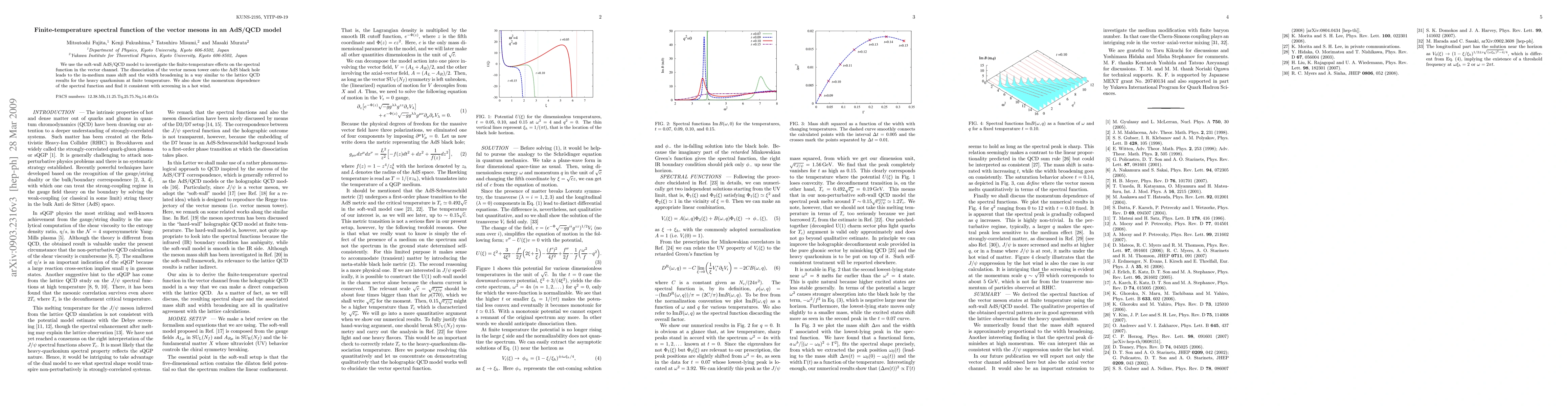 This paper investigates the finite-temperature effects on the spectral function of vector mesons using the soft-wall AdS/QCD model, revealing in-medium mass shifts and width broadening akin to lattice QCD results for heavy quarkonium. It also demonstrates the momentum dependence consistent with screening in a hot medium.