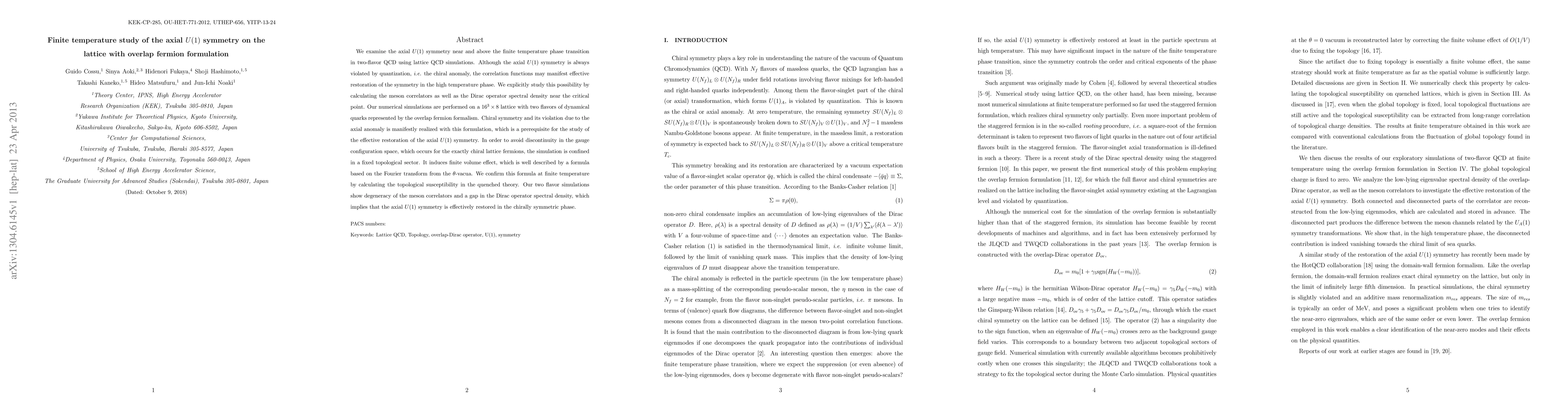 This study investigates the restoration of axial U(1) symmetry near and above the phase transition in two-flavor QCD using lattice QCD simulations with overlap fermions. Results show degeneracy in meson correlators and a gap in the Dirac operator spectral density, indicating effective restoration of the axial U(1) symmetry in the high-temperature phase.