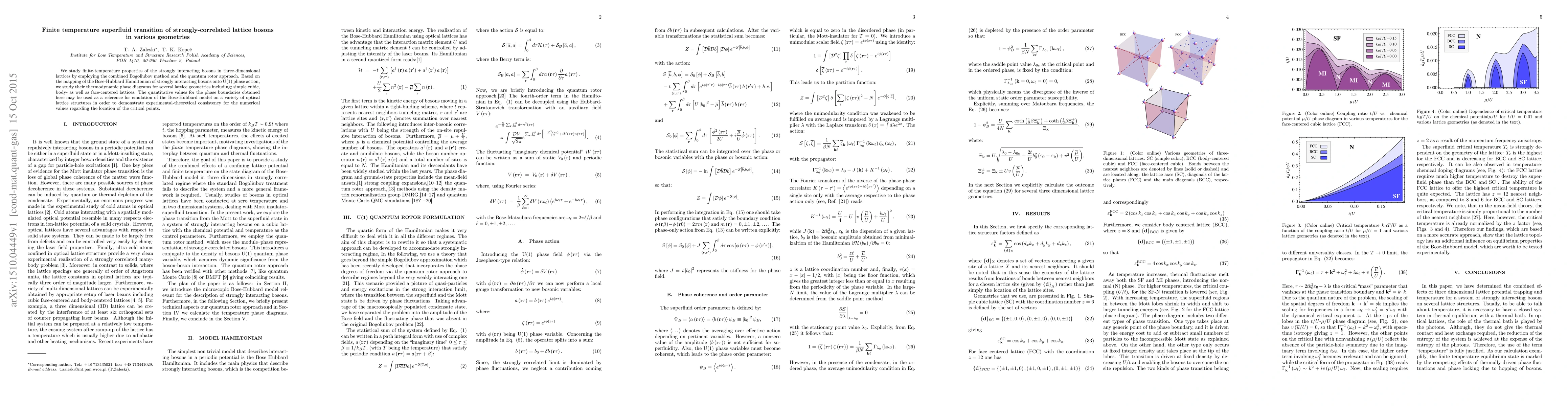 This paper investigates the finite-temperature superfluid transition of strongly interacting bosons in three-dimensional lattices using the combined Bogoliubov method and quantum rotor approach. It maps the Bose-Hubbard Hamiltonian onto U(1) phase action to study thermodynamic phase diagrams for various lattice geometries, providing quantitative values for phase boundaries to validate optical lattice experiments.