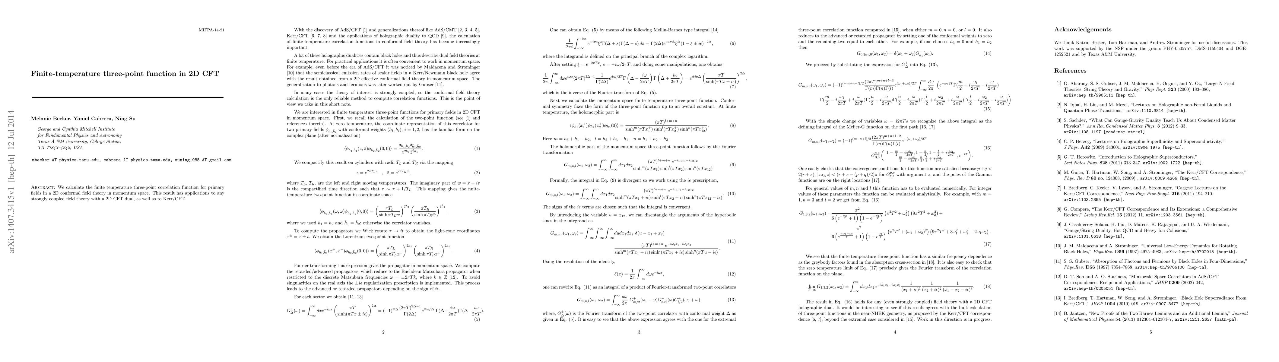 We calculate the finite temperature three-point correlation function for primary fields in a 2D conformal field theory in momentum space. This result has applications to any strongly coupled field theory with a 2D CFT dual, as well as to Kerr/CFT.